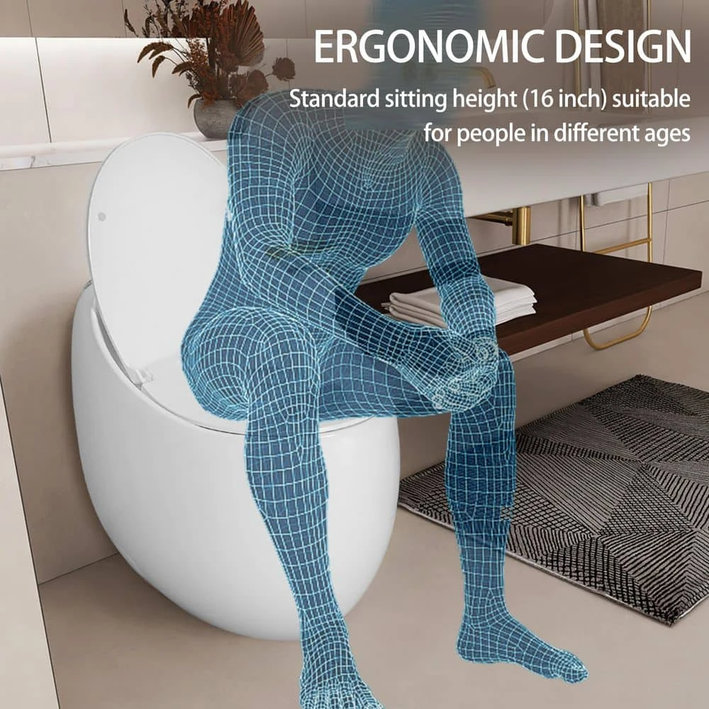This toilet stands out with its unique egg-shaped design, seamlessly merging practicality and aesthetics to break free from mundane styles. The quick-release seat requires no tools for removal, enabling effortless cleaning, while the soft-closing feature ensures a gentle, silent shut. Crafted from seamless one-piece porcelain with a multi-glazed surface, it resists dirt buildup and simplifies maintenance. Operating on a single-flush system that uses just 1.28 gallons per flush, it prioritizes water efficiency. Designed at standard height with ergonomic precision, it offers optimal comfort for users of all ages and body types. Its larger, quieter flushing mechanism further enhances the experience by minimizing noise, making it a functional and stylish addition to any bathroom.