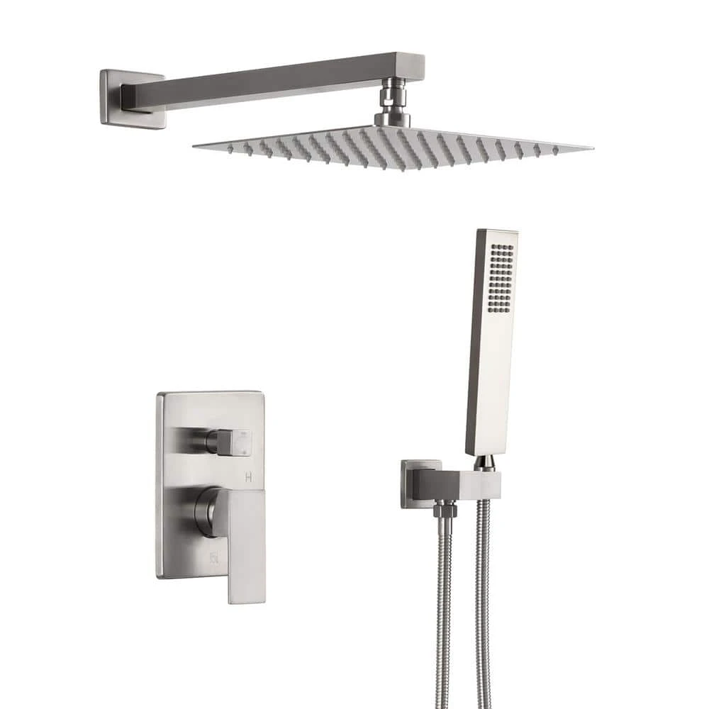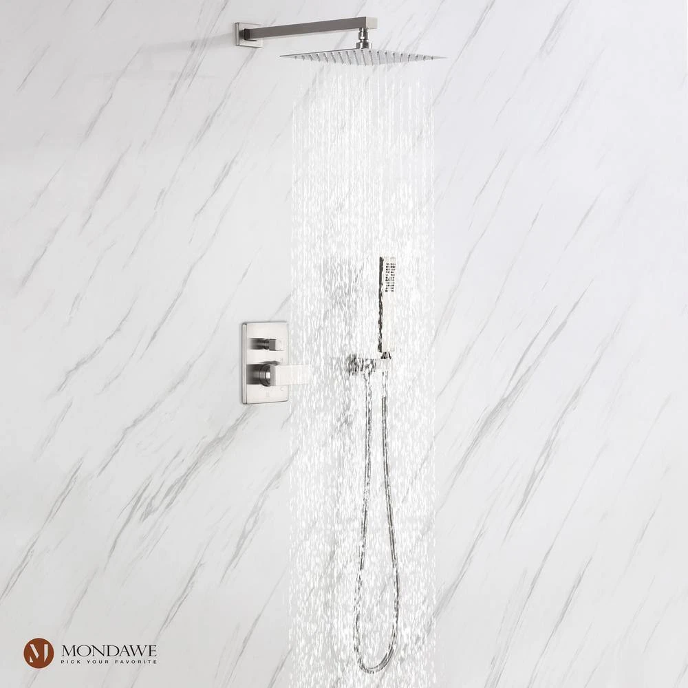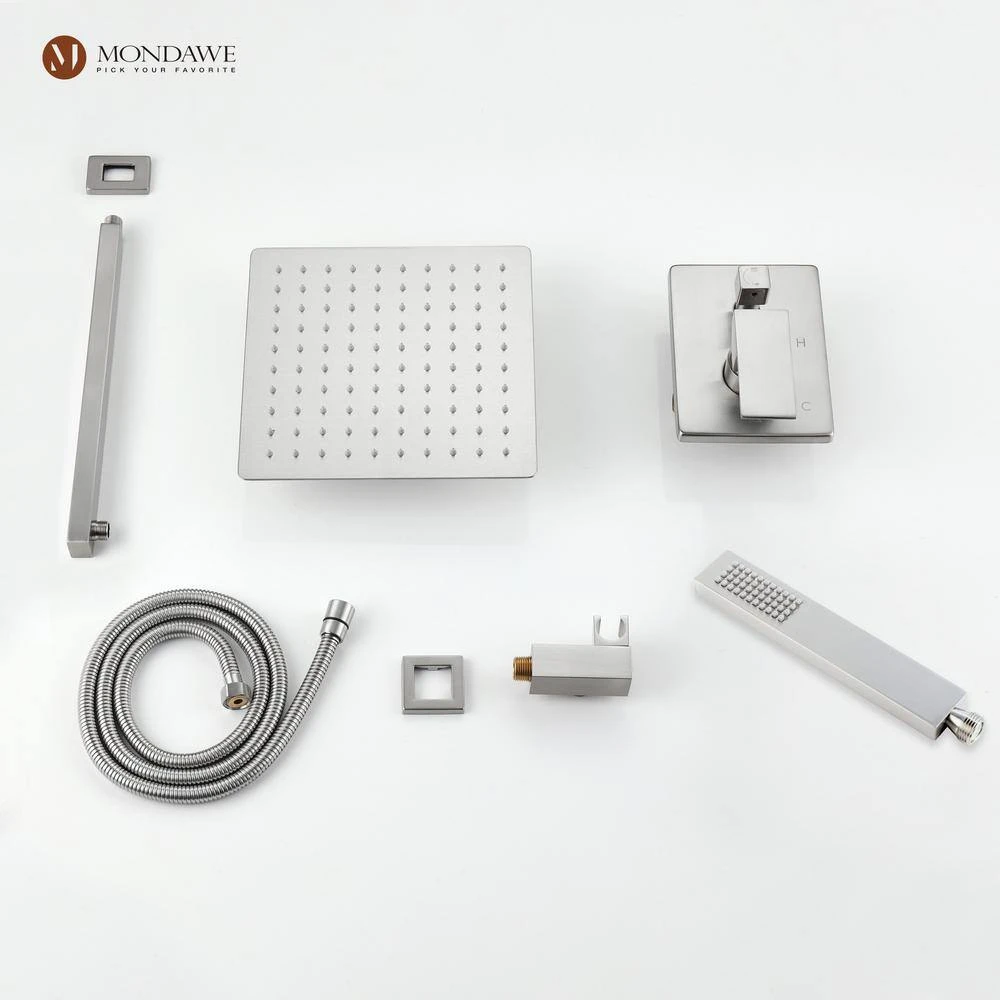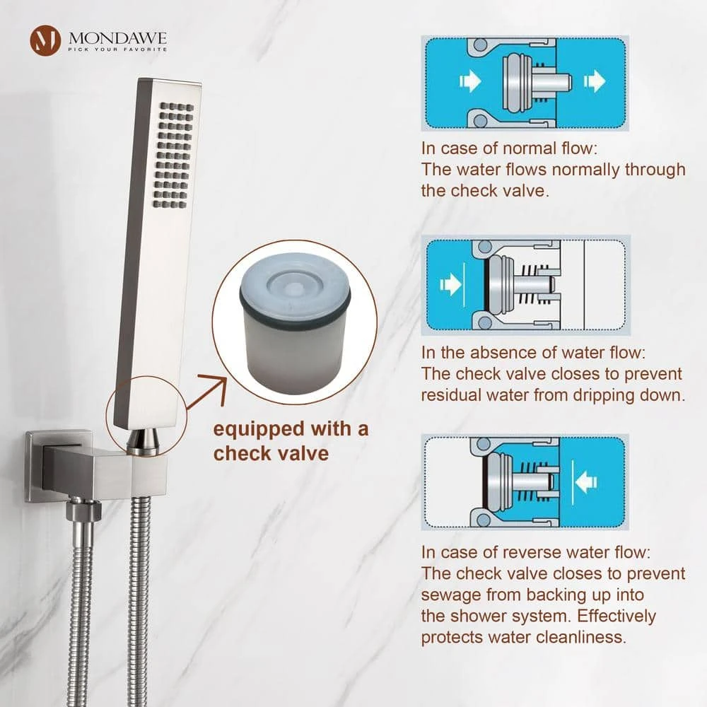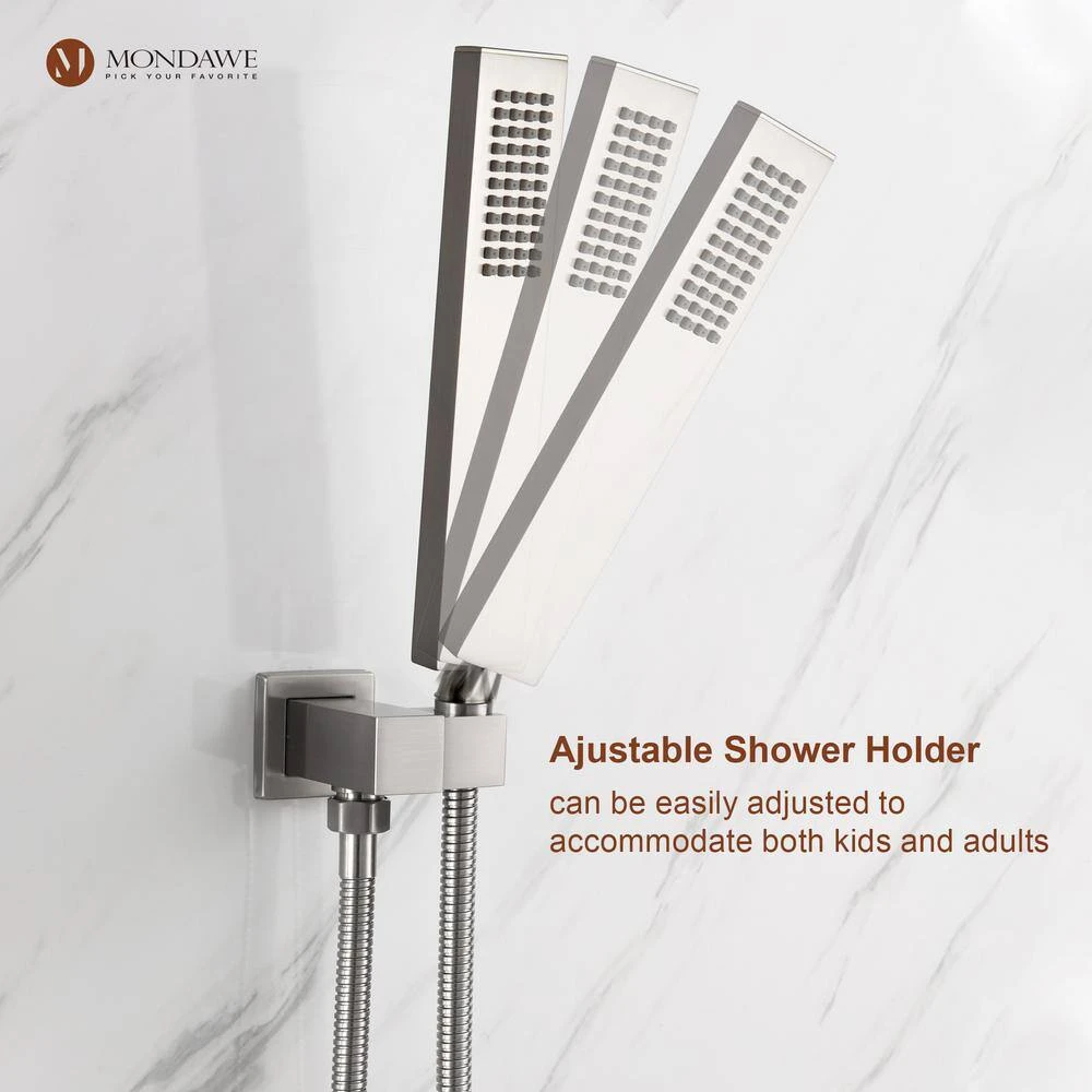 The Tub Shower Faucet with Valve and Shower Head Systems offers a sophisticated wall-mounted shower combo set for your bathroom. It includes a durable 10 in. stainless steel 304-shower head, a matching stainless steel shower arm, and an ergonomic zinc alloy handle for smooth operation. The set also features a Brass handheld shower with a 59 in. hose for maximum flexibility, along with a sturdy brass holder for convenient storage. The wall connector ensures a secure and leak-free connection, enhancing the overall functionality of the shower faucet set. Overall, this shower combo set combines style, durability, and convenience, making it an excellent choice for any bathroom.