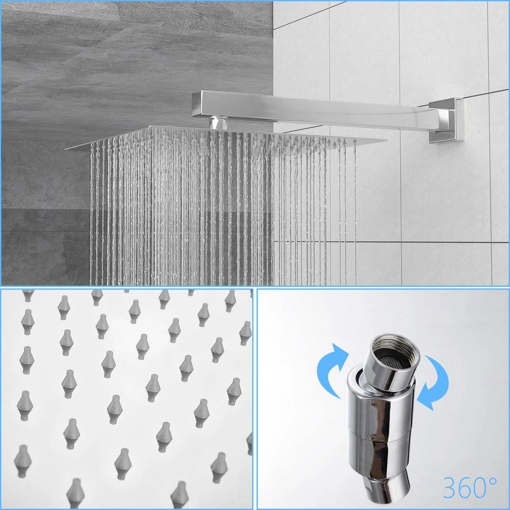 Our innovative shower system showcases an array of impressive features, including an Anti-scald Pressure-Balanced Valve equipped with 2- check valves that efficiently eliminate water hammer noise and prevent scalding caused by abrupt temperature changes. The ultra-thin overhead Rainfall Shower Head boasts extensive coverage, delivering a soothing downpour experience with 360° adjustability for ultimate relaxation. The wall-mounted design is fully pre-piped, facilitating easy retrofit of existing showerheads and compatible with G1/2 in. – 14 NPT inlet single hole US standard thread, making it suitable for American plumbing systems. Maintaining hygiene is effortless with the silicone nozzles on both the rain shower head and handheld spray, which effortlessly remove mineral deposits with a simple swipe. Furthermore, our multifunctional shower set seamlessly integrates a rain shower with a handheld shower, catering to diverse showering needs. The comprehensive package includes a 12 in. Square rain shower head, Shower Arm, handheld shower head, a generous 59 in. shower hose, shower holder, water control valve, as well as all necessary parts and installation instructions, ensuring a hassle-free setup and years of enjoyable showers.