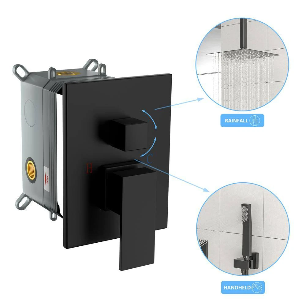 Our premium shower system boasts an array of exceptional features, starting with the Anti-scald Pressure-Balanced Valve, equipped with 2- check valves that efficiently mitigate water hammer noise and safeguard against scalding caused by sudden temperature fluctuations. The ultra-thin, ceiling-mounted rainfall shower head provides an expansive coverage, offering a serene downpour experience with 360° adjustability. Designed for effortless installation, the fully pre-piped system can seamlessly retrofit existing showerheads and is compatible with G1/2 in. – 14 NPT inlet single hole US standard plumbing. Maintaining cleanliness is simple, thanks to the silicone nozzles on both the rain shower head and handheld spray that effortlessly remove mineral deposits with a single swipe. Our multifunctional shower set combines the elegance of a 16 in. sq. rain shower head with the convenience of a handheld shower, catering to all your showering preferences. The comprehensive package includes a Shower Arm, 59 in. shower hose, shower holder, water control valve, along with all necessary parts and detailed installation instructions, ensuring a smooth setup and years of luxurious showers.