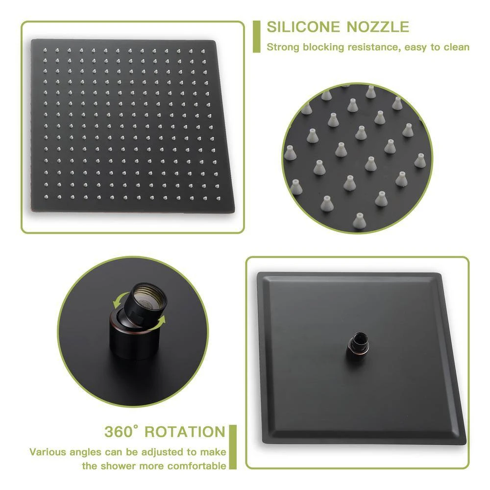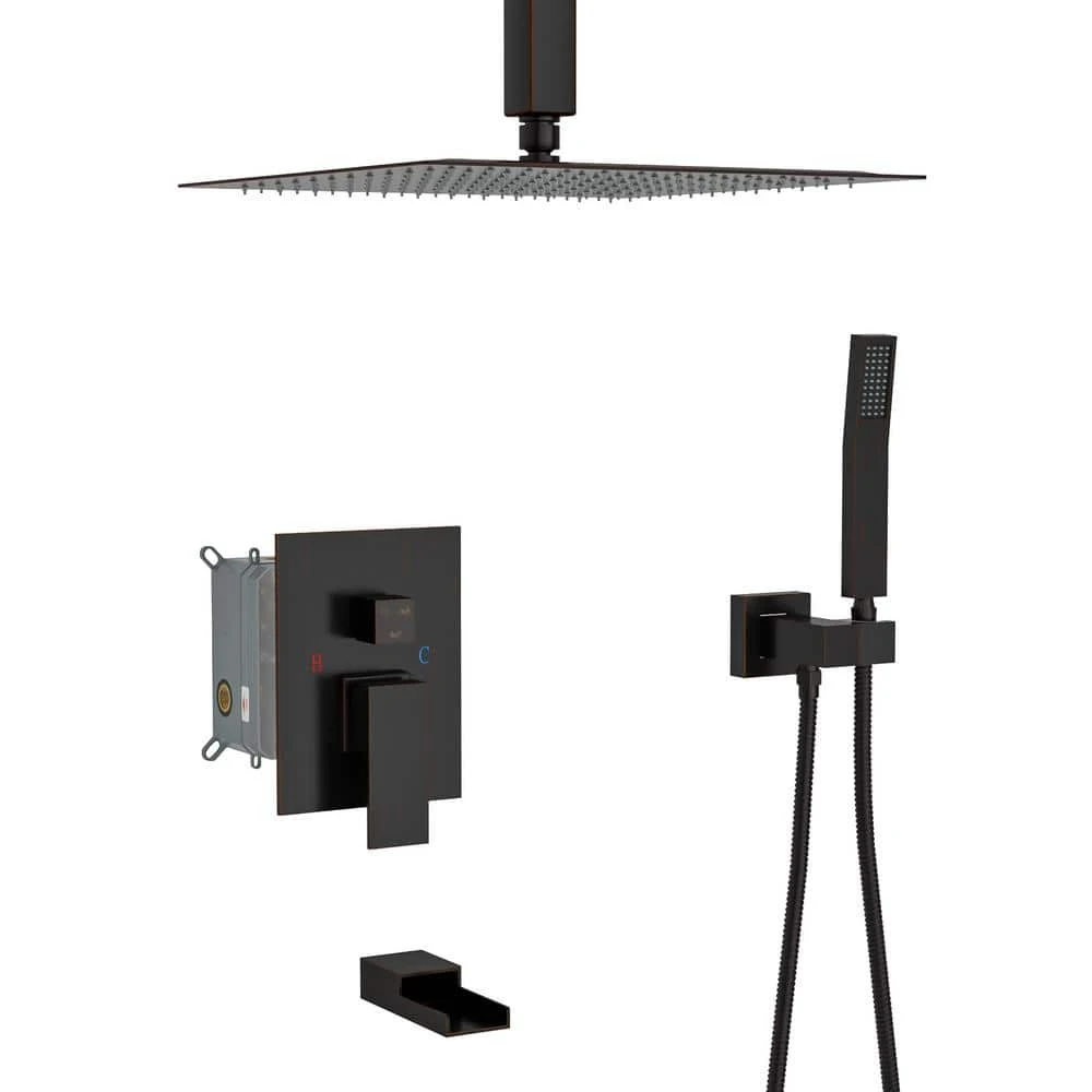 Our shower system is a versatile 3-in-1 solution, featuring a tub spout, overhead rainfall shower head and handheld shower, tailored to meet your diverse needs. The Waterfall Tub Spout efficiently fills your bathtub swiftly with its larger water output, minimizing temperature loss and saving you time. The 16 in. rainfall shower head delivers a full-body, high-pressure showering experience, while the handheld shower with a 59 in. hose allows for unrestricted movement during your shower. Equipped with an Anti-Scald Pressure-Balanced Valve, it ensures safety by eliminating water hammer noise and preventing scalding from temperature fluctuations. The ultra-thin rainfall shower head boasts 360° adjustability for a soothing downpour shower. Installation is a breeze with its ceiling mount, fully pre-piped design and compatibility with US plumbing standards. Maintenance is effortless thanks to the silicone nozzles that effortlessly remove mineral deposits. The package includes a 16 in. square rain shower head, shower arm, handheld shower head, tub spout, 59 in. shower hose, shower holder, water control valve, along with all necessary parts and installation instructions.