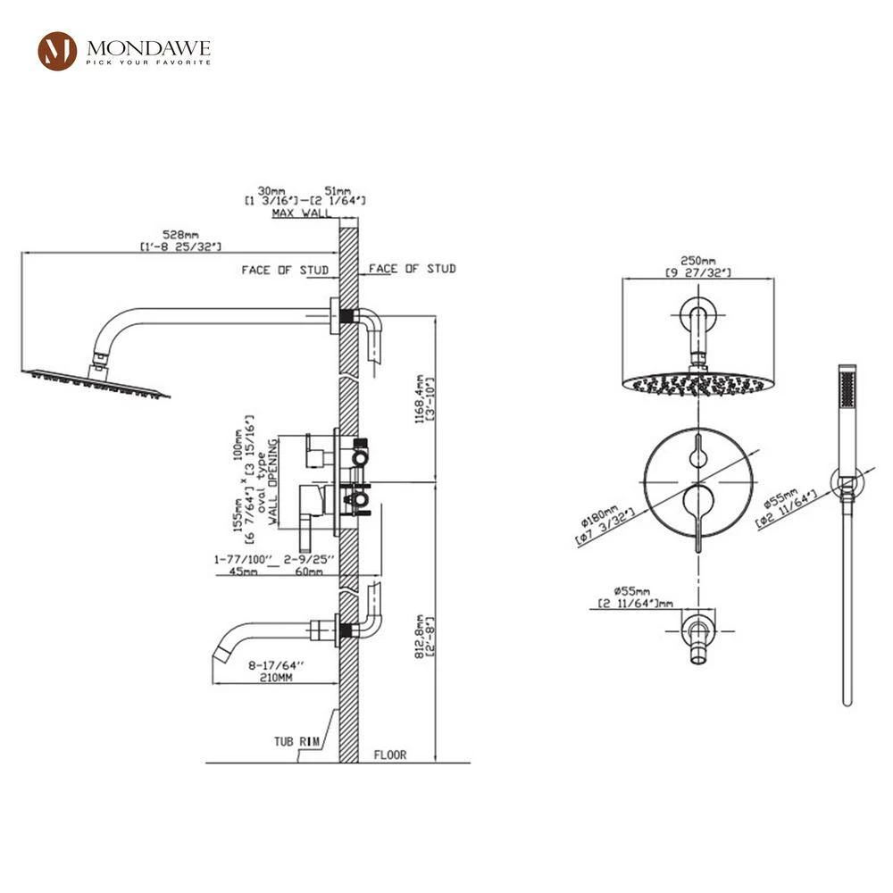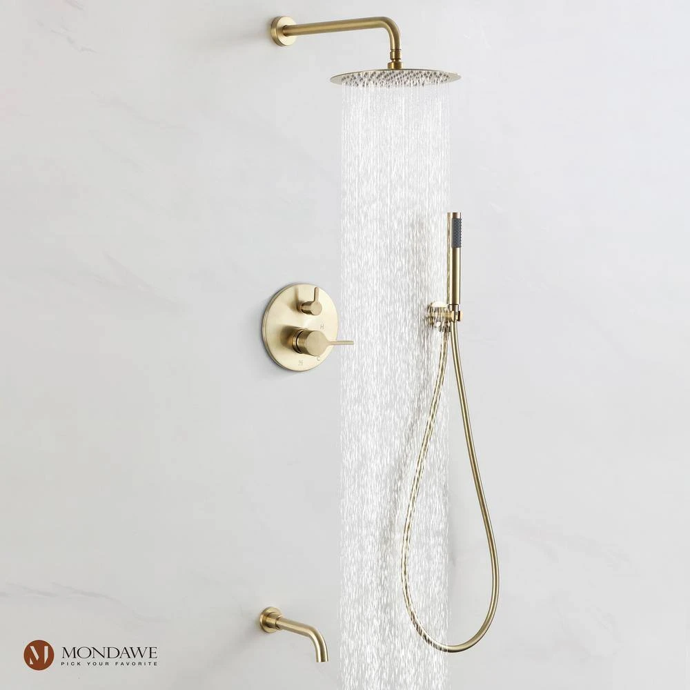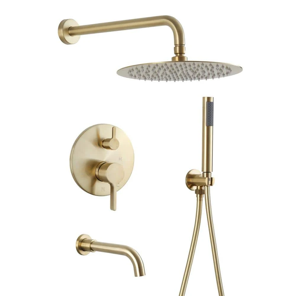 The Tub Shower Faucet Wall Mounted Combo Set for Bathroom is a comprehensive and stylish shower system that offers a luxurious bathing experience. The set includes a 10 in. stainless steel 304-shower head for optimal water flow and coverage, a matching stainless steel shower arm for stability and durability, a zinc alloy handle for smooth and precise temperature control, a Brass handheld shower with a 59 in. hose for unparalleled flexibility and convenience, a brass wall connector for reliable and sturdy installation, and a stainless steel spout for added elegance and corrosion resistance. The sleek and modern design complements any bathroom decor, making it an excellent choice for both functionality and aesthetics.