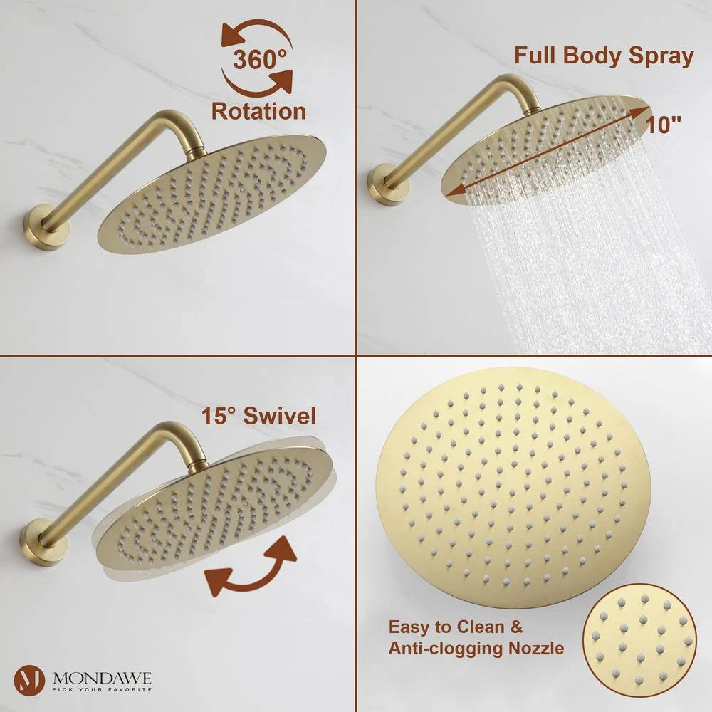 - Pvd brush gold finishes: shower fixtures feature premium plated finishes to resist corrosion, tarnishing, and discoloration for the life of the shower