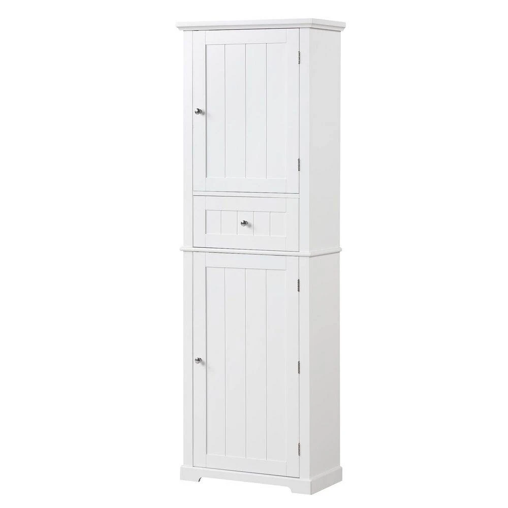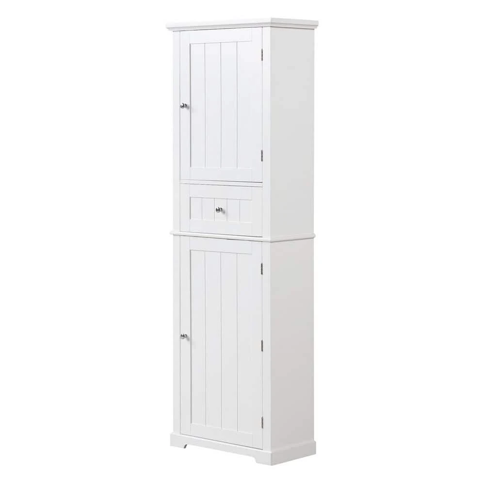 The product features a cabinet crafted from high-quality MDF boards with a water-proof, smooth painted finish, making it effortless to clean. Equipped with metal round knobs, the drawer and door operate smoothly. One adjustable shelf in the lower cabinet can be configured to three heights, accommodating various-sized items such as shampoo, towels, body lotion, tissues, and storage baskets, fulfilling daily needs. The cabinet boasts two enclosed sections with shelves and a middle drawer featuring slide rails for enhanced usability, providing ample storage space to keep the room organized. Additionally, it includes an anti-toppling device for wall attachment, ensuring safety by preventing accidental tipping and protecting users or children from injury. Assembly is straightforward, with pre-drilled holes in the MDF boards, accompanied by an instruction manual and hardware pack for easy installation.