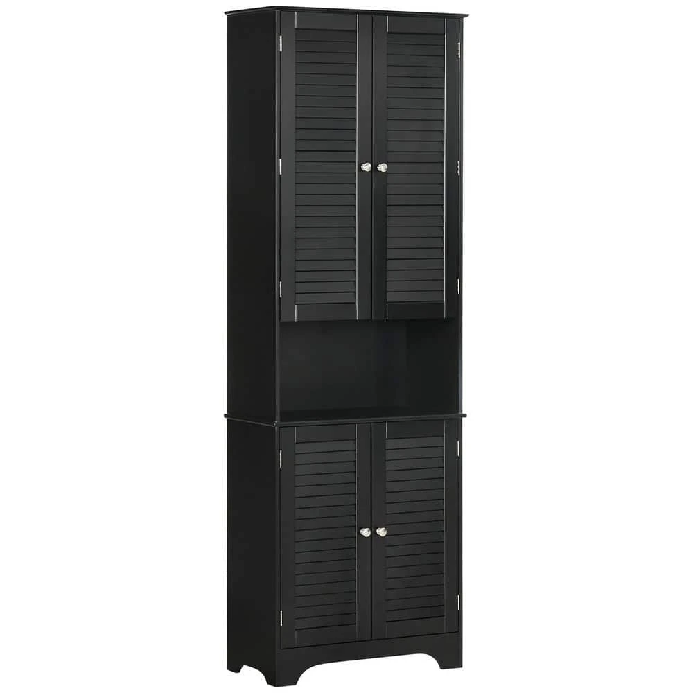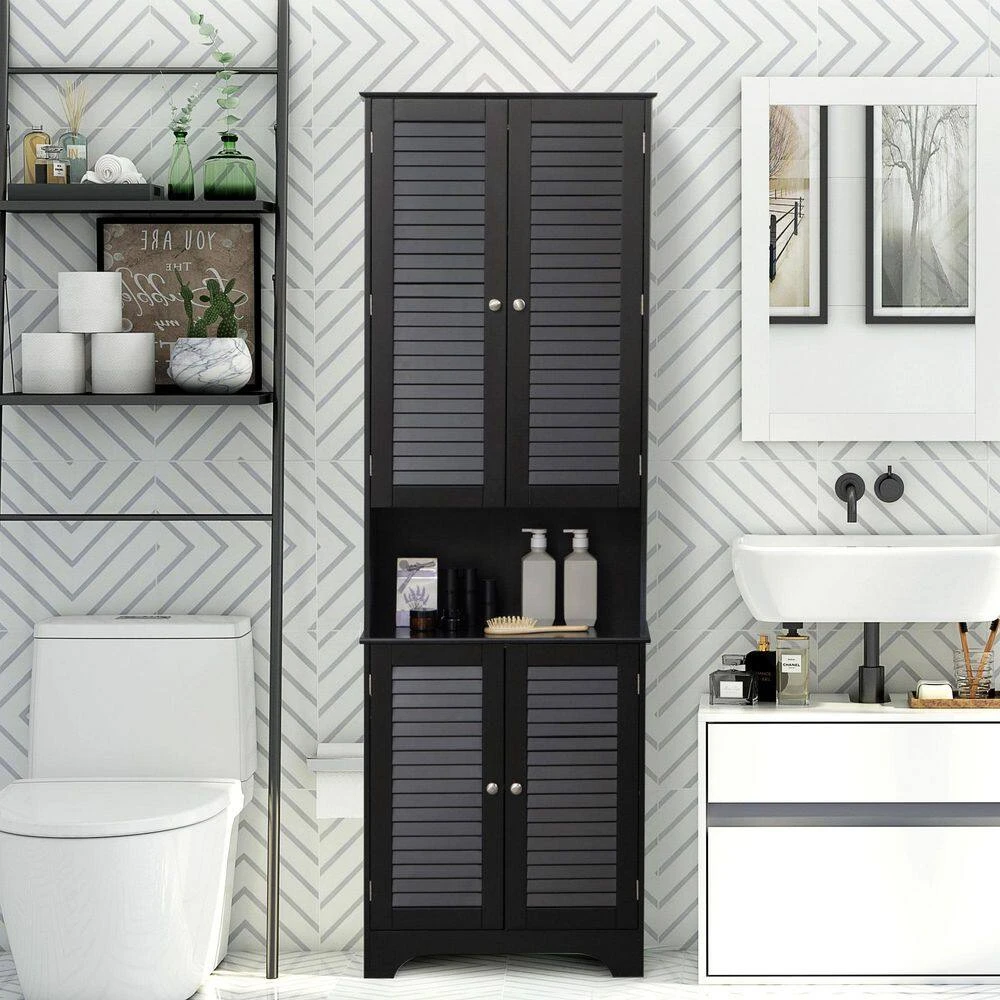 This tall cabinet is perfect for tight spaces. Its compact and stylish design features many shelves, ideal for bathrooms.Made of painted P2 grade MDF and particleboard with a melamine – coated surface, it’s stable, resists water splashes, and has an anti – tilt design for extra stability. The shutters ensure breathability inside. It offers flexible and generous storage. The upper cabinet has an adjustable shelf for larger items, and the middle flat surface provides extra countertop space. Magnetic closures keep the doors closed.This versatile unit isn’t just for bathrooms; use it in the living room, entryway, office, etc. You can turn it into a bookcase or kitchen pantry. Overall dimensions are 23.5 in. W x 11.75 in. D x 71.75 in. H, with a total weight capacity of 132 lbs. and 22 lbs. per shelf.