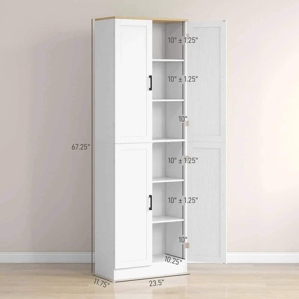 Are you still worried about the lack of kitchen space? HOMCOM kitchen cabinets are here! With 6 layers of large storage space, 4-doors to protect against dust, and 2-adjustable shelves, both large and small items can be properly placed. The stylish appearance with two-color matching and metal embellishments is both beautiful and functional; the anti-dumping design on the back protects the safety of your family. Easily expand the kitchen storage and decorate your home style.