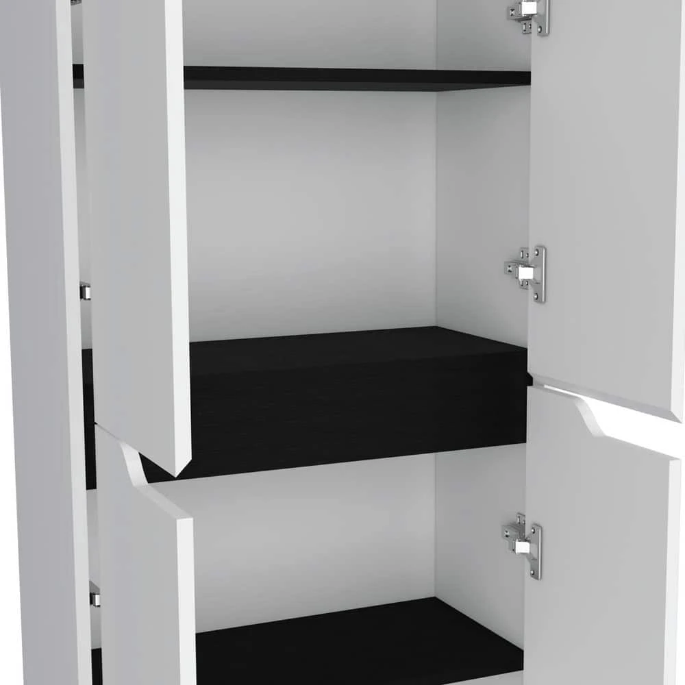 66.9 in. slender body, 4-door design + 5-layer partition, kitchen ingredients, tableware, sundries can all be put in. Environmentally friendly board material is moisture-proof and wear-resistant, and the simple shape is suitable for various home styles. Small kitchen can also have large capacity.