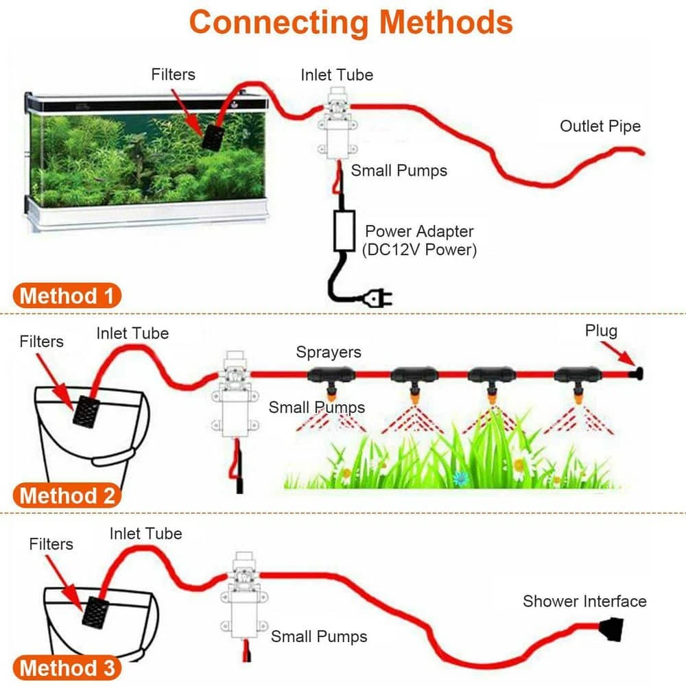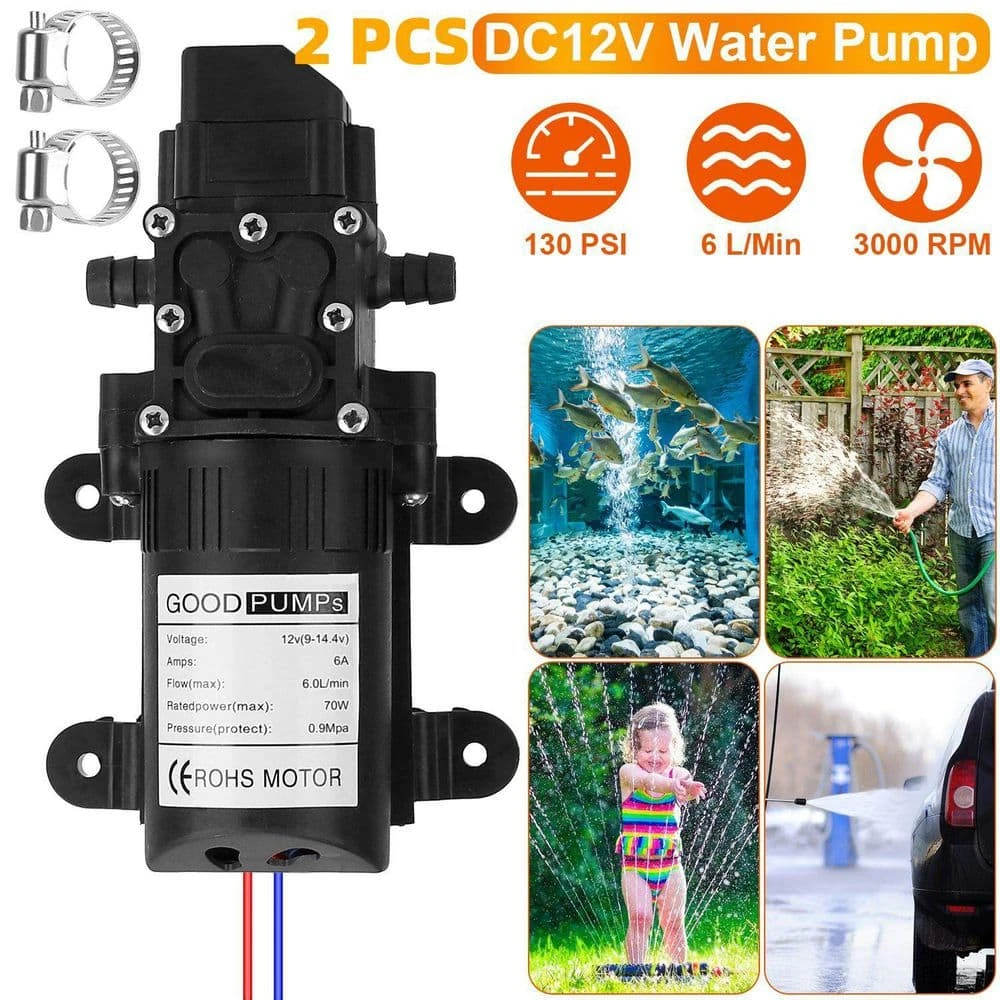 This 12-Volt self-priming water pump features a self-priming function that prevents liquid backflow, allowing it to be mounted above water tanks (note: do not submerge it in water). It comes with 2 tube clamps for secure connection to 8mm inner diameter hoses, with the left hose for water inlet and the right for outlet. Wiring is simple-just connect the two wires to a converter, regardless of positive or negative poles. For optimal use, install it in a dry, well-ventilated area (it cannot work in water), and it automatically shuts off when outlet pressure exceeds 130 PSI. With wide application, it’s suitable for sprayers, garden sprinklers, lawns, showers, RVs, special vehicles, ships, beverage equipment, vehicle/carpet/ground cleaning, and water purification or treatment systems.