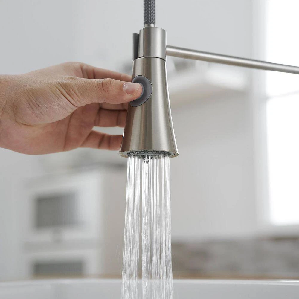 Our Kitchen Faucet with Pull – Out Sprayer is a versatile and user – friendly addition to any kitchen. This Brushed Nickel Kitchen Sink Faucet features a single – handle design, making it easy to control both water temperature and flow volume. With the Single Handle Single Lever Kitchen Faucet, you can effortlessly mix hot and cold water, ensuring stable water pressure for all your kitchen needs.The faucet offers MULTIFUNCTIONAL OUTLET WATER options. You can switch between a stream setting for filling water containers and a spray setting for efficient rinsing, which makes cleanup a breeze. The high – arc 360° swivel design of this Commercial Brushed Kitchen Faucet with Pull – Out Sprayer allows for easy access to all areas of the sink.Installation is a straightforward process. It supports 1 or 3 – hole installation (with an extra – purchase deck plate if needed), and all the necessary mounting hardware is included. This Spring Pull – out Kitchen Sink Faucet enables easy DIY installation in less than 25 minutes. There’s no need to hire a plumber, saving you both money and time.