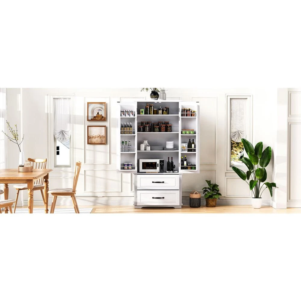 Infuse your kitchen with retro elegance. This white oak sideboard features a classic retro style with delicate grooved edges and embossed texture panels. 8-door interior shelves + 6 large storage areas + 3 adjustable shelves + 2 full-pull drawers, easily storing food, tableware and small appliances. High-quality MDF material + anti-dumping accessories, stable and durable, easy to install, making the kitchen both beautiful and tidy.