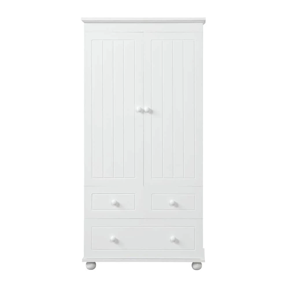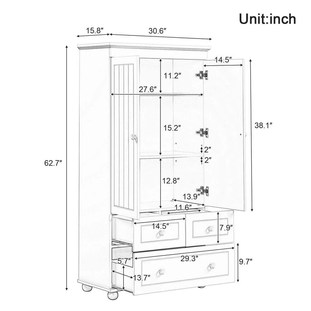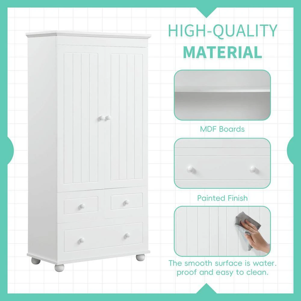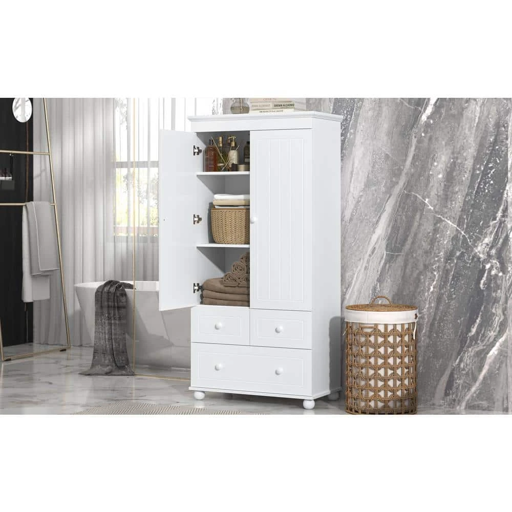 This tall storage cabinet boasts high-quality features, constructed with MDF boards for its main frame and doors, finished with a smooth, waterproof, and easy-to-clean painted surface. It includes metal handles, hinges, and drawer slides for durability. Offering ample storage, it features an upper enclosed cabinet with three tiers, two small drawers, and one large drawer to keep your space organized. The adjustable shelf can be (set to 3) different heights to accommodate various items. Suitable for multiple settings, it can function as a bookcase in an office, a storage cabinet in a bathroom, or a pantry in a kitchen. Safety is enhanced with pre-drilled holes for an anti-tipping device, ideal for families with children. Easy to assemble, the product includes pre-drilled holes, an installation manual, and hardware pack for a successful setup.