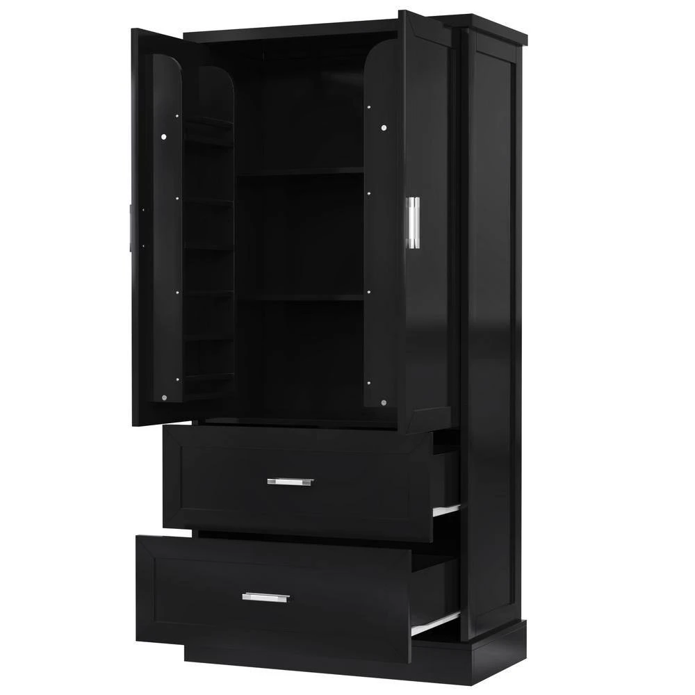 This storage cabinet features a high-quality MDF construction with a painted, waterproof, and easy-to-clean surface, complemented by sturdy metal handles, hinges, and drawer slides. It boasts ample storage options, including 3-tiered upper cabinets and two spacious lower drawers suitable for various items like shampoo, towels, and more. With an adjustable middle shelf and multi-layer door shelves, it caters to diverse storage needs. Versatile in use, it can serve as a bookcase in an office, a storage cabinet in a bathroom, or a pantry in a kitchen. Safety is ensured with an anti-tipping device that secures the cabinet to the wall, ideal for families with children. Easy to assemble, the product includes pre-drilled holes, an installation manual, and all necessary hardware for a successful setup.