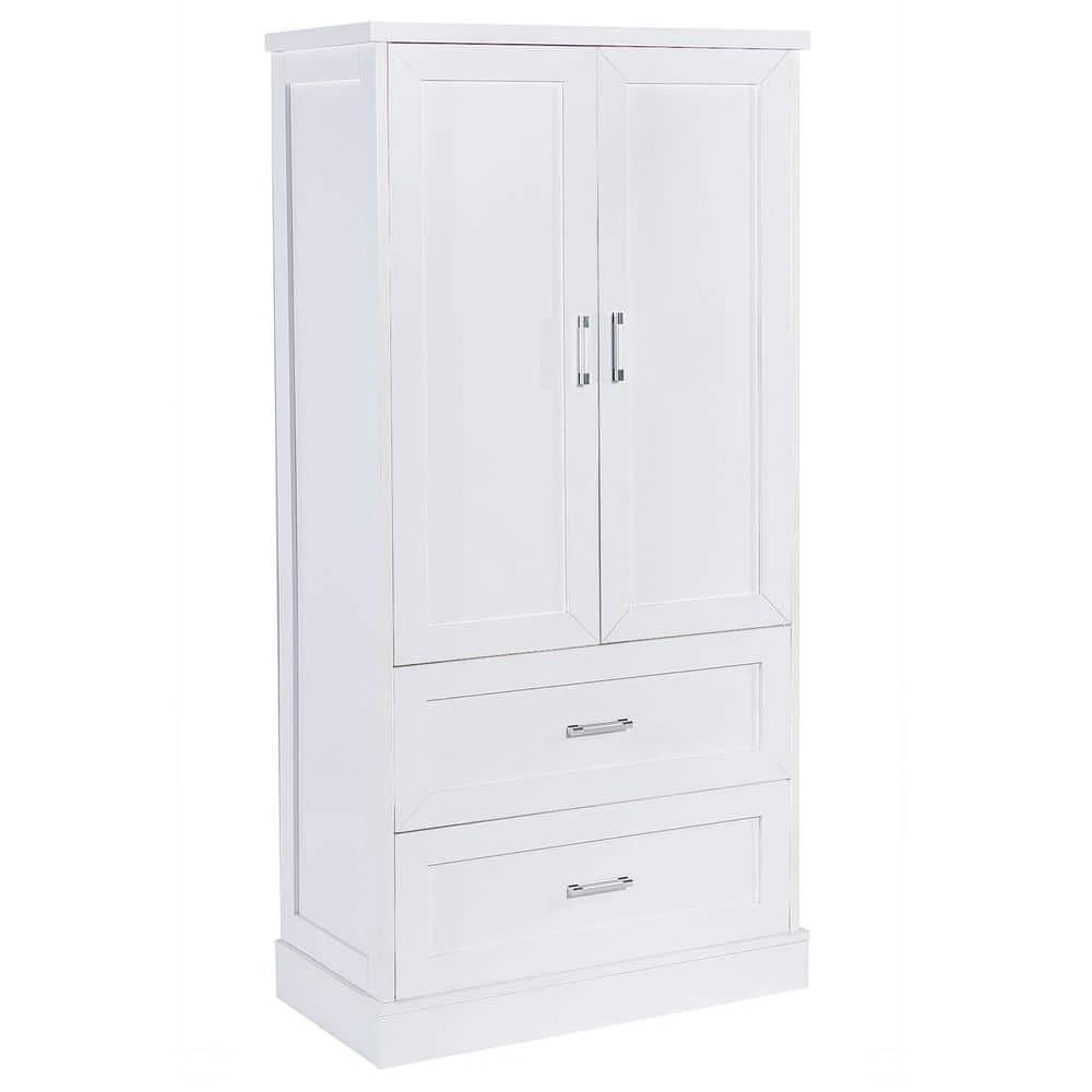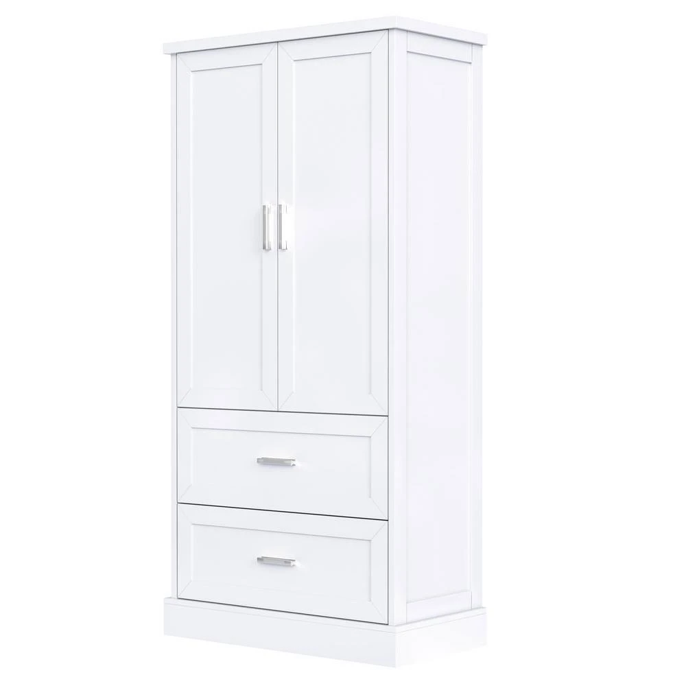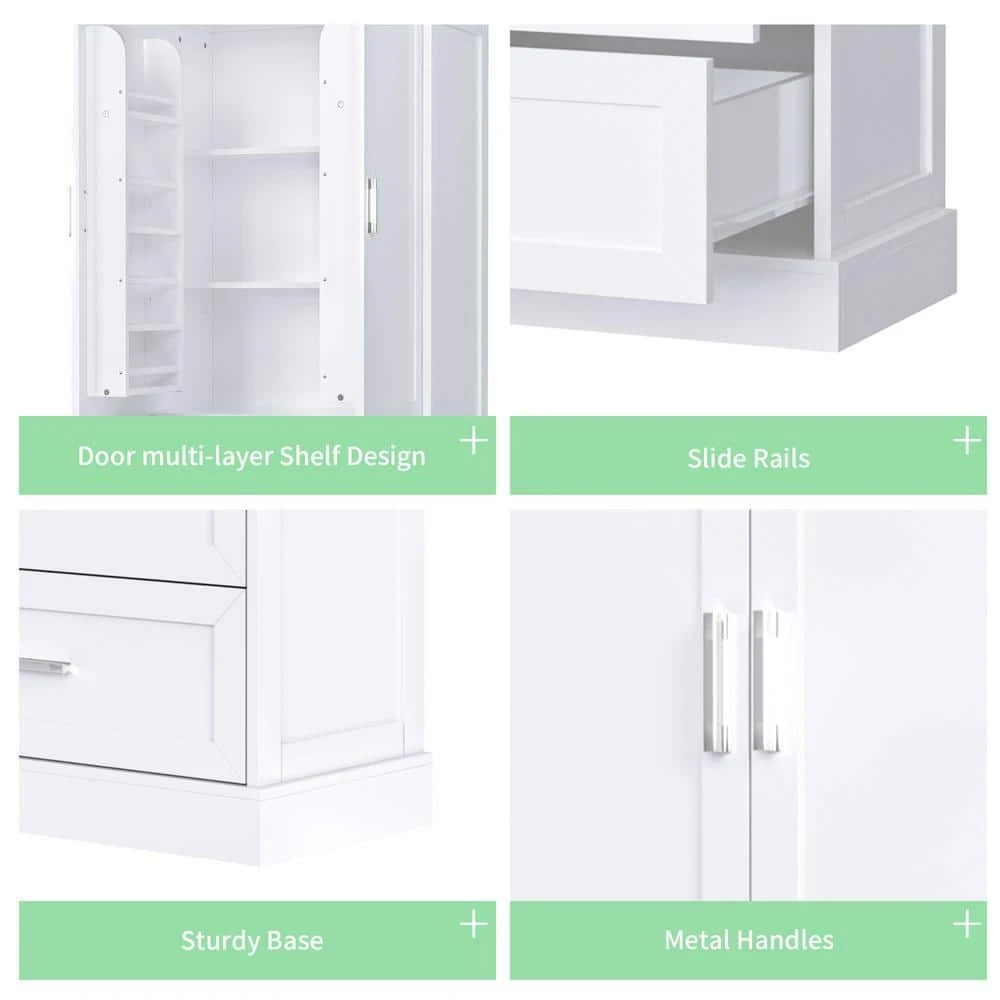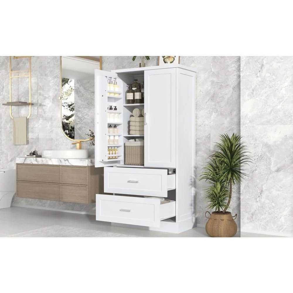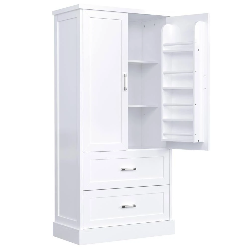 This tall and wide storage cabinet features a main frame and doors crafted from high-quality MDF boards with a smooth, waterproof, and easy-to-clean painted finish, complemented by sturdy metal door handles, hinges, and drawer slides. It offers ample storage space with an upper enclosed cabinet boasting three tiers for decorations or daily essentials and two large drawers in the lower section for items like shampoo, towels, and body lotion. The second shelf is adjustable to accommodate different-sized items, while the multi-layer shelf design on the door provides additional storage options. Suitable for various settings such as offices, bathrooms, and kitchens, the cabinet also includes an anti-tipping device for enhanced safety, especially in homes with children. Easy to assemble, the product comes with pre-drilled holes in the MDF boards, an installation manual, and a hardware pack to ensure a successful setup.