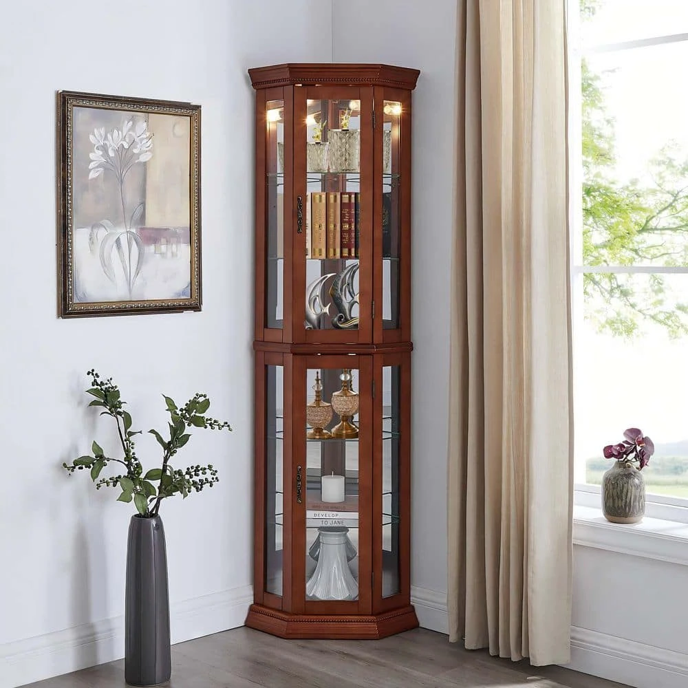 Corner display cabinets feature a gorgeous appearance with practical storage. The top lighting system, mirrored back panel and glass side panels make the collections such as ornaments and antique books shine. Selected high-quality engineered wood with natural walnut veneer, carved beads and brass handles, show elegant style. 2-fixed shelves and four tempered glass shelves can be flexibly adjusted. The wooden frame tempered glass door is dust-proof and damage-proof, and the anti-dumping belt is escorted. The specifications of 69.75 in. H x 21.5 in. W x 16 in. D can bear 150 lbs. Detailed installation guide is included to easily decorate corners and inject artistic atmosphere into your home.