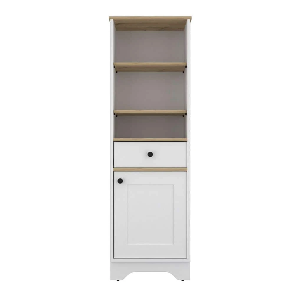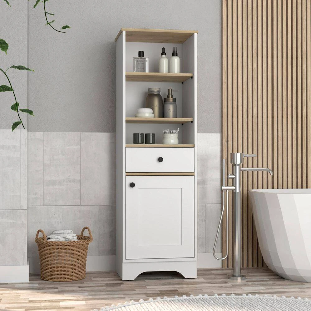 Upgrade your bathroom style. This elegant light oak white bathroom cabinet, with its unique design and ample storage space, instantly becomes the focal point of the space. The 3 -layer open shelf (15.5 in. wide) easily stores daily necessities, the lockable drawer protects personal belongings, and the single-door double-layer cabinet is moisture-proof for more peace of mind. Practical and aesthetic, creating a neat and advanced bathroom experience.