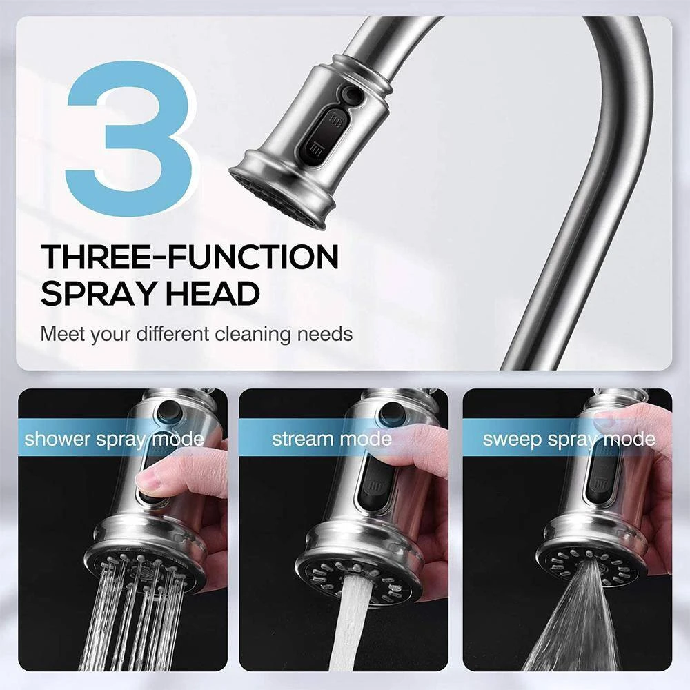 Our Kitchen Faucet offers excellent Product Features. The Quality CeraMixeratures resists sand, rust, and hard water, with valves tested to last over 500,000 uses.The 3 – Function Sprayer has Spray, Stream, and Rain modes. The 17.7 in. Pull Down Sprinkler Hose provides diverse cleaning options for kitchen tasks.It’s 100% Lead – Free, certified to CUPC and NSF – 61 for safety. The brushed nickel finish resists fingerprints, and the stainless – steel material stops water dots around the sink.Installation and cleaning are easy, taking less than 20 minutes. The mixer size is 1.30 in. – 1.38 in. (33 – 35mm), with a max deck thickness of 1.77 in. (45mm).This faucet has a Deck Mounting Type, Brushed Finish, and is made of Stainless Steel in Brushed Nickel color. It has 1 handle for 1 – hole setups, with a Lever handle type. The style is Brushed Nickel with 1 Sprayer, installed via Deck Mount. The max flow rate is 1.8 GPM, handle of stainless steel, spout height 5.12 in., reach 8.2 in.. It weighs 6.49 lbs. with dimensions 25×11.81×2.76 in., in a Tall size. The pattern is a Spring Pulldown Faucet, Gooseneck shape, max pressure 60 PSF, Contemporary head style, Ultra – Fine grit. It’s for Indoor/Outdoor use and needs no batteries.