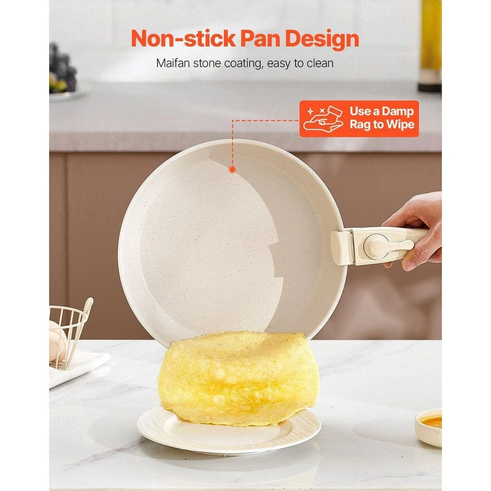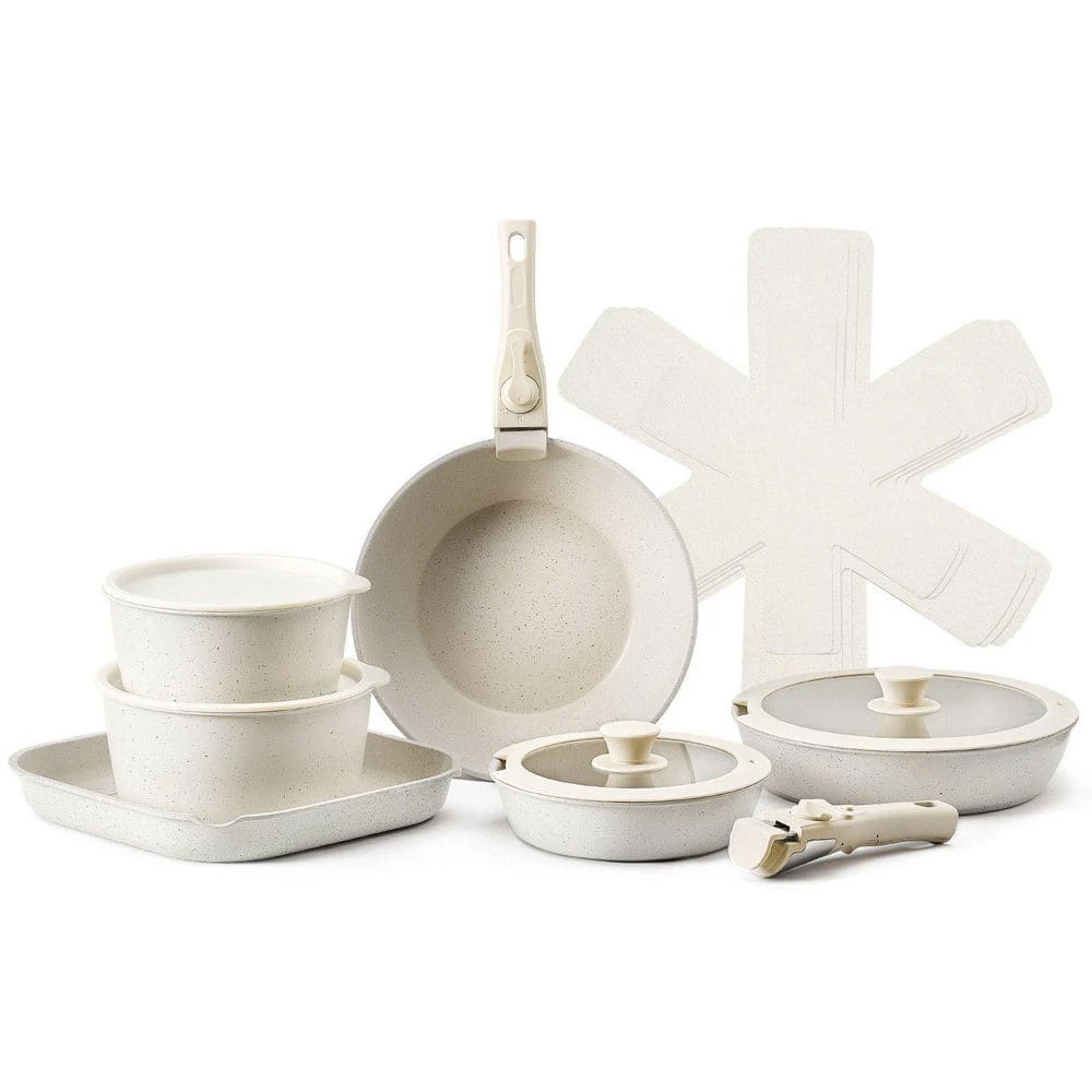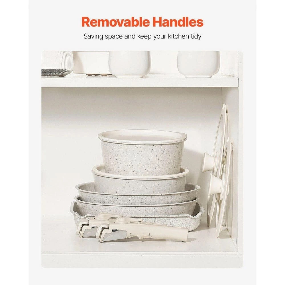 This 17-piece cookware set is versatile and space-saving, meeting various cooking needs with its complete lineup: 7in/8in sauce pans, 8in/10in frying pans, 10in saute pan, 11in square grill pan, 2 removable handles, 3 silicone lids (8in/10in/7in), 2 fridge storage lids (8in/7in), and 5 pan protectors (2x10x10in, 3x14x14in).It features a detachable handle system-handles can be replaced with one press, and removing them saves up to 70% storage space, making it easy to stack in cabinets or RVs. Crafted with Maifan stone non-stick coating (lead, cadmium, PFOA-free), it ensures easy food release and cleaning, withstands up to 380°C, and comes with transparent glass lids for easy cooking monitoring.Made of 2.5mm thick aluminum, the cookware heats quickly and evenly; its high-magnetic conductive bottom works with all stovetops (gas, electric, induction). It’s also multi-purpose, transitioning from stovetop to oven, grill, fridge, or tabletop, with an elegant design that elevates dining presentation.