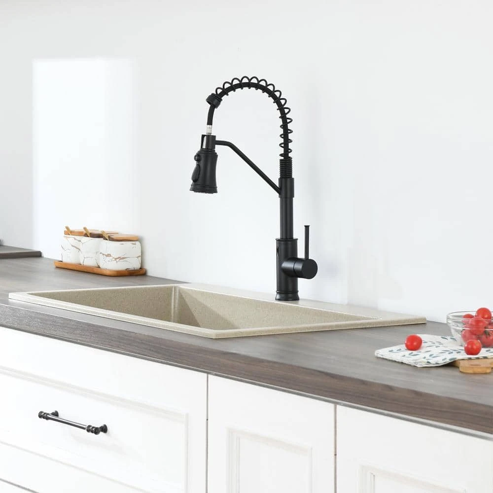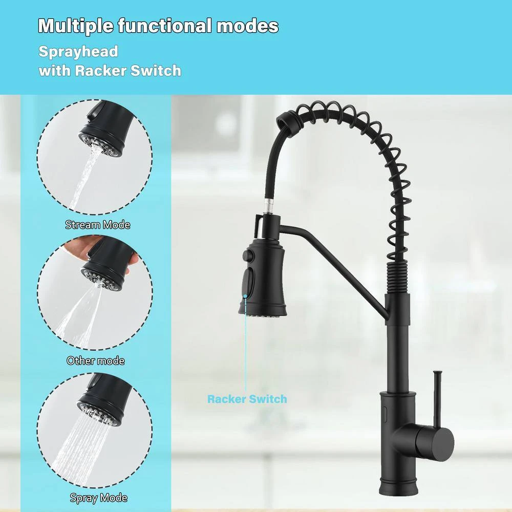 This premium kitchen sink faucet combines durability and functionality with its lead-free solid brass construction, featuring a flawless, rust- and corrosion-resistant finish for easy maintenance and long-lasting reliability. The dual-function pull-down sprayer offers versatility with an aerated stream for daily cleaning and a powerful pre-rinse spray for tough tasks, while the magnetic docking system keeps the nozzle securely in place when not in use. Designed for efficiency, the ergonomic single-handle lever allows precise control of water flow and temperature, and its 90-degree forward rotation makes it ideal for compact kitchens by fitting into tighter spaces. The 360° swivel high-arc spout provides ample clearance for washing large cookware and full sink access, with an optimized height that fits seamlessly under standard cabinets. Installation is effortless thanks to cUPC-certified stainless steel waterlines and a brass fixing part, it effortlessly blends style and performance for any kitchen.