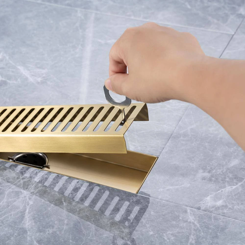 - Open the grate from both sides of the linear shower drain by using a lifting hook the strainer can filter hair and particulate impurities effectively,