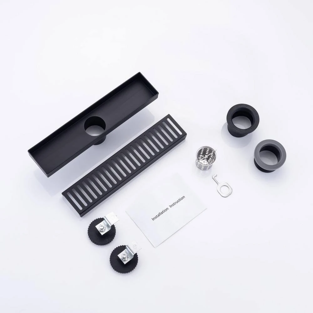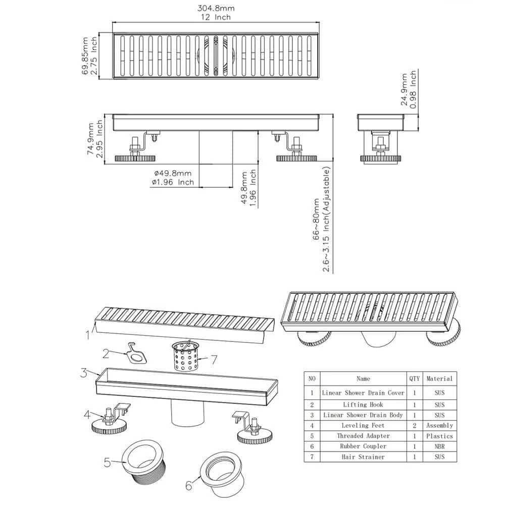 - Components include the following accessories: 1 x linear shower drain body, 1 x floor drain cover, 2 x adjustable leveling feet, 4 x T-shape bracket, 1 x rubber coupler, 1 x threaded adapter, 1 x hair strainer, 1 x shower hook, 1 x install instruction