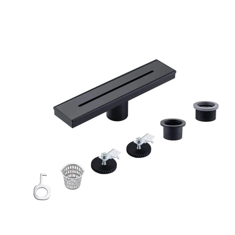 - Components include: 1 x linear shower drain body, 1 x floor drain cover, 2 x adjustable leveling feet, 4 x T-shape bracket, 1 x rubber coupler, 1 x threaded adapter, 1 x hair strainer, 1 x shower hook, 1 x install instruction