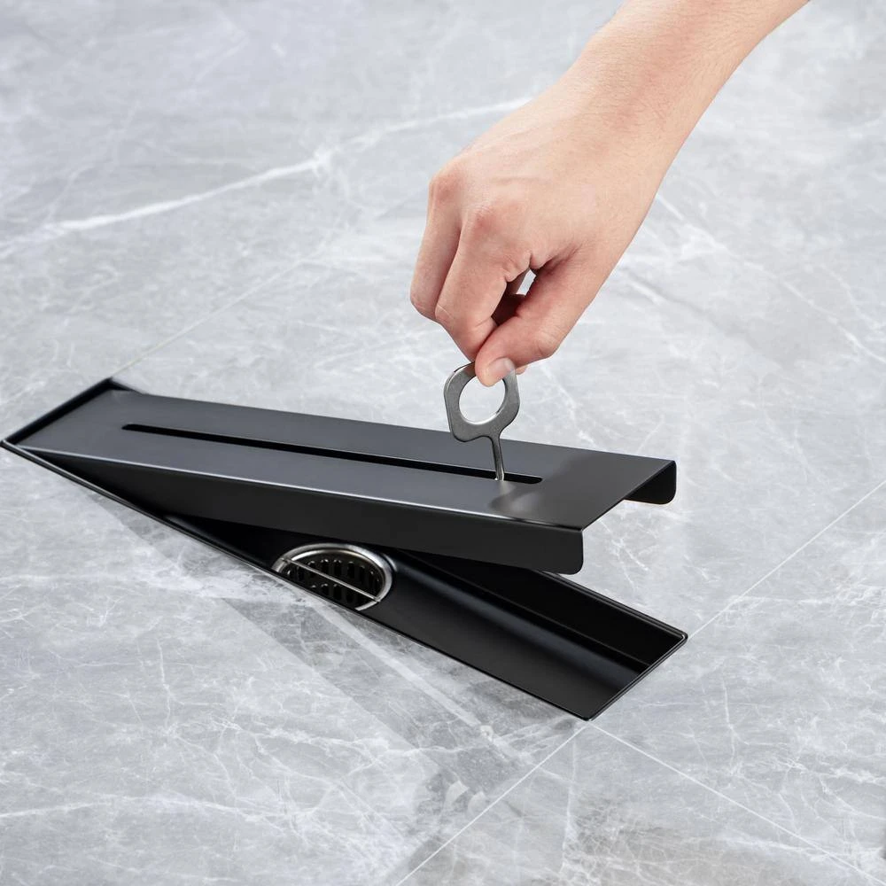 - Open the grate from both sides of the linear shower drain by using a lifting hook, the strainer can filter hair and particulate impurities effectively