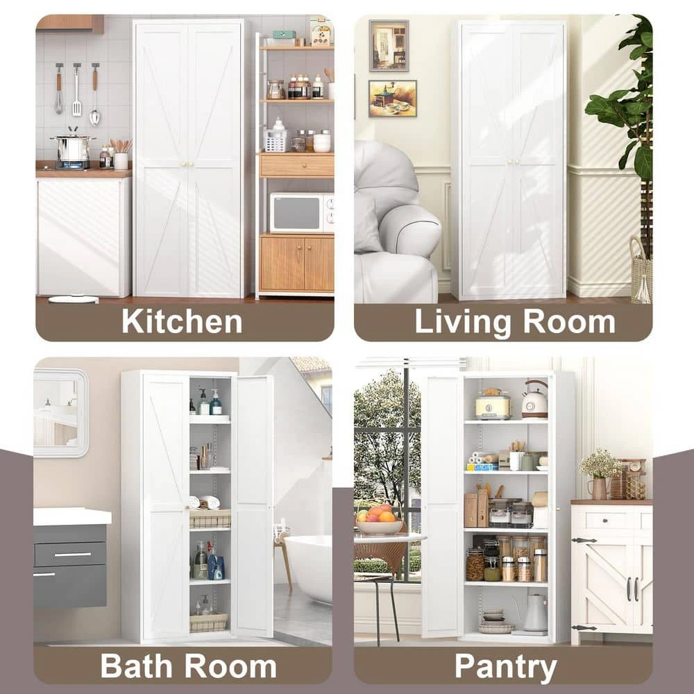 This kitchen pantry storage cabinet is built for durability, made of premium powder-coated steel that resists scratches and corrosion, plus it’s easy to maintain-its four adjustable shelves each hold up to 180 pounds, offering a sturdy, reliable storage solution. Designed to impress, it has a chic striped door and two attractive gold handles that boost visual appeal, blending seamlessly with various decor styles, while the white cupboard’s doors use powerful magnets for a secure shut.Highly versatile, it works in the kitchen, living room, bedroom, or office-you can use it as a pantry, food storage, or regular cabinet based on your needs. It also prioritizes stability: four adjustable feet keep it balanced, and two pre-drilled back holes prevent tipping. Assembly is simple too, with straightforward instructions and all required tools included, and we provide outstanding post-purchase support to ensure your satisfaction.