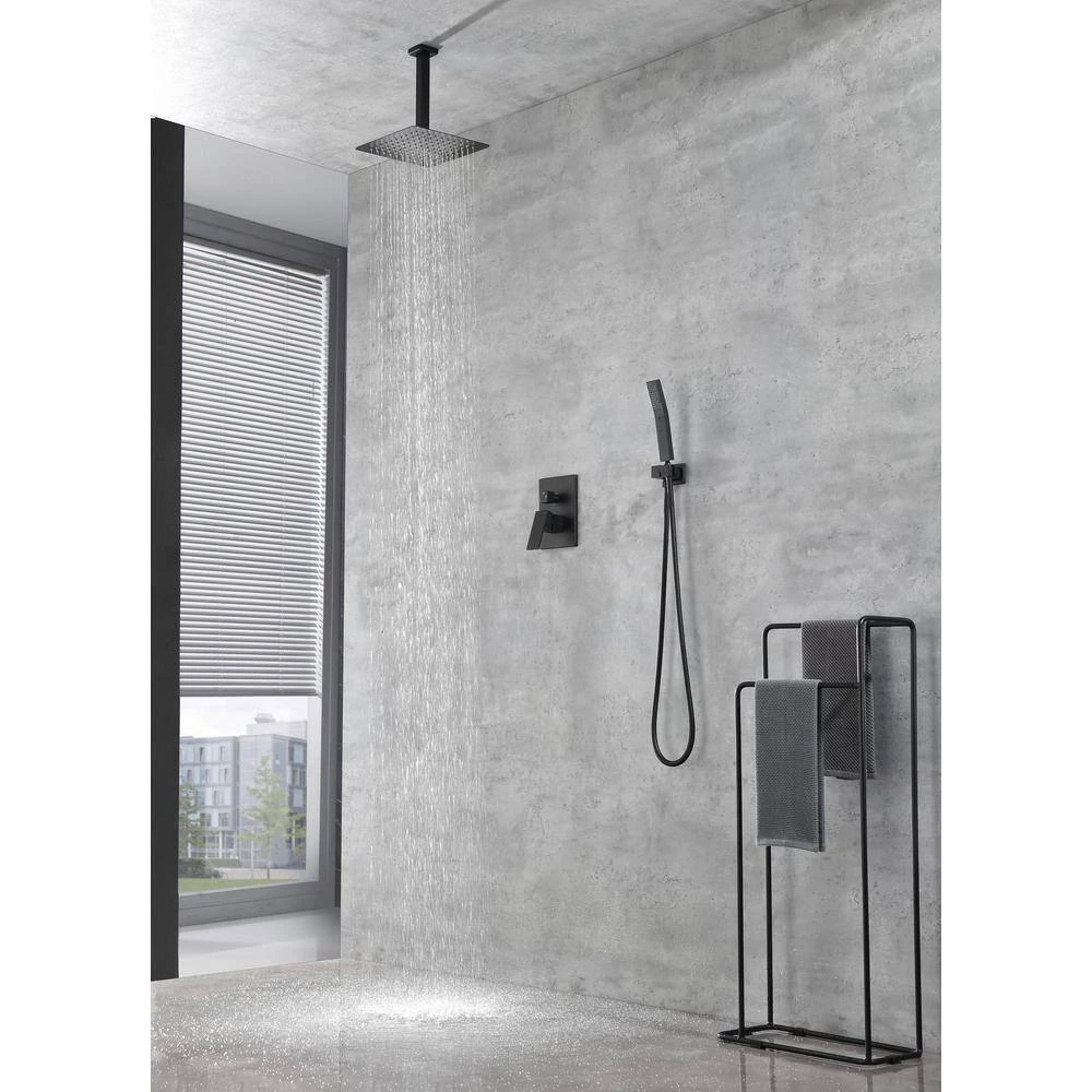 Indulge in luxury with our 2-In-1 shower faucet set. Whether you prefer the gentle Rainfall from the ceiling mount shower head or the targeted efficiency of the wall-mounted handheld shower, our system ensures water exactly where you need it. Separate temperature controls add convenience, while the stainless steel and brass construction guarantees durability and a stunning water spray. our sleek matte black finish adds the perfect touch of elegance and performance to your bathroom.
