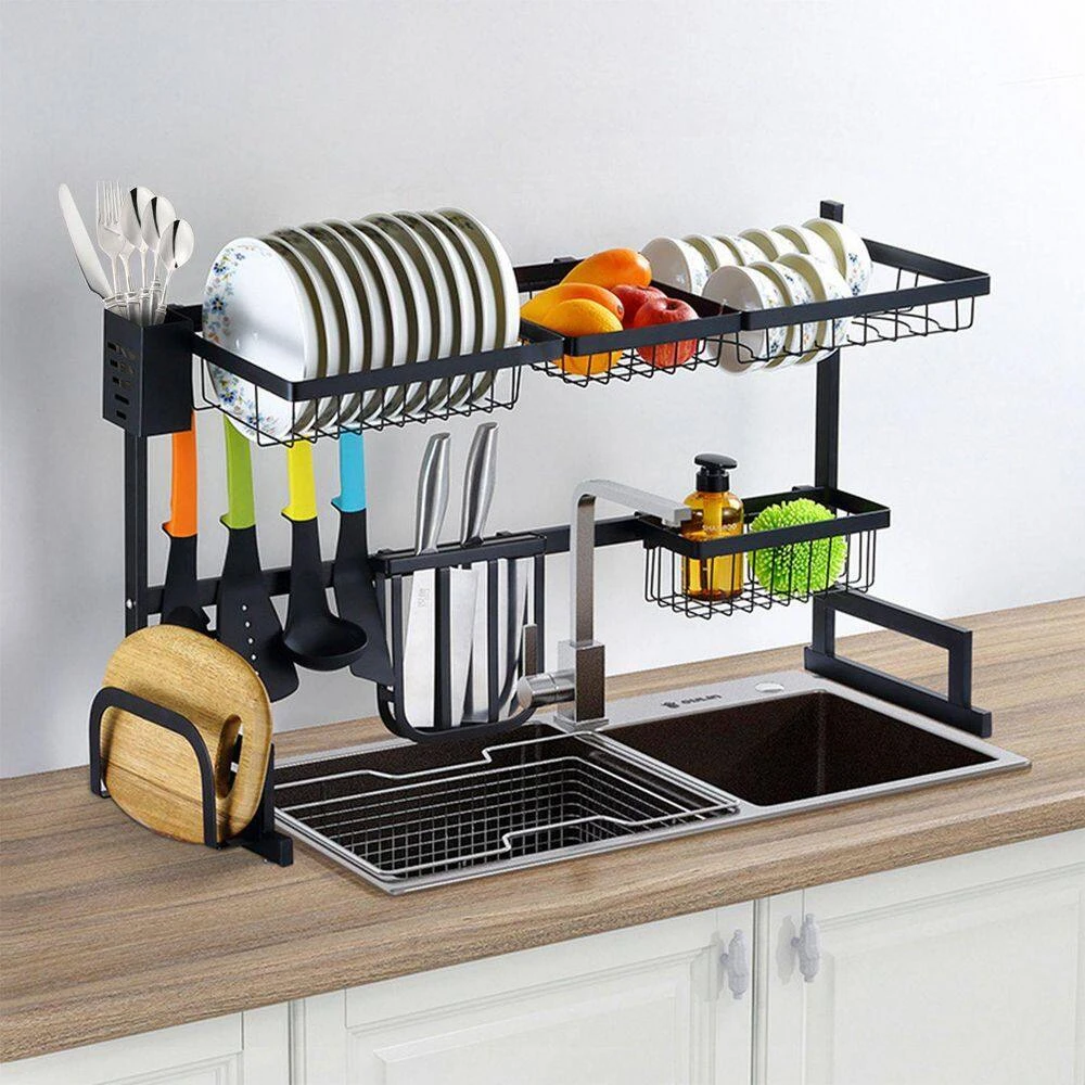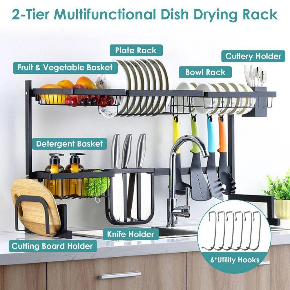 This 2 – tier over – sink rack has a large – capacity design, coming with 4 various baskets, 1 knife holder, 1 cutlery holder, and 1 cutting board holder. It can separately store up to 12 bowls, 10 plates, cups, fruits & vegetables, cutting boards, spoons & forks, detergent, knives, etc. It makes full use of the space above the sink, keeping assorted items neatly stored and easy to access at a glance, ideal for both small and large kitchens.With dimensions of 33.7×12.4×20.3 inches (without tableware), it fits most sinks. But before purchasing, measure: sink length ≤ 32.5 inches, faucet height ≤ 15.75 inches, and height from cabinet bottom to countertop ≥ 20.3 inches. Made of premium thick stainless steel, the rack is rustproof, corrosion – resistant, anti – bending, and sturdy. 4 suction cups at the bottom prevent falling or shaking, and it has a maximum loading capacity of 88 lbs, strong enough for food and kitchen supplies.It’s easy to assemble within minutes using the included wrench. Detachable holders let you freely arrange the rack’s layout as per your habits. For maintenance, just remove all holders, rinse with soapy water, and wipe with a soft cloth. It’s recommended to clean it once a week to prolong service life and prevent bacterial growth.