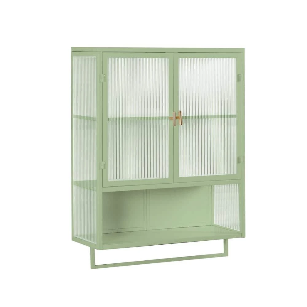 This modern and concise sideboard, featuring simple lines and minimalism shape, perfectly matches any home decoration with its high-end green finish. Crafted from iron and tempered glass with meticulous craftsmanship, it boasts exceptional strength, stability, and resistance to rust, erosion, and wear. The wall-mounted design maximizes space utilization, while the functional 2-door cabinet with 2-tier storage, open shelves, and towel rack meets various storage needs. The detachable shelf inside accommodates items of different sizes, and the easy-to-assemble design comes with all necessary hardware and detailed instructions. The overall design conforms to spatial geometric aesthetics, adding a modern style to your living room while providing ample storage space and dust protection with its fluted tempered glass.