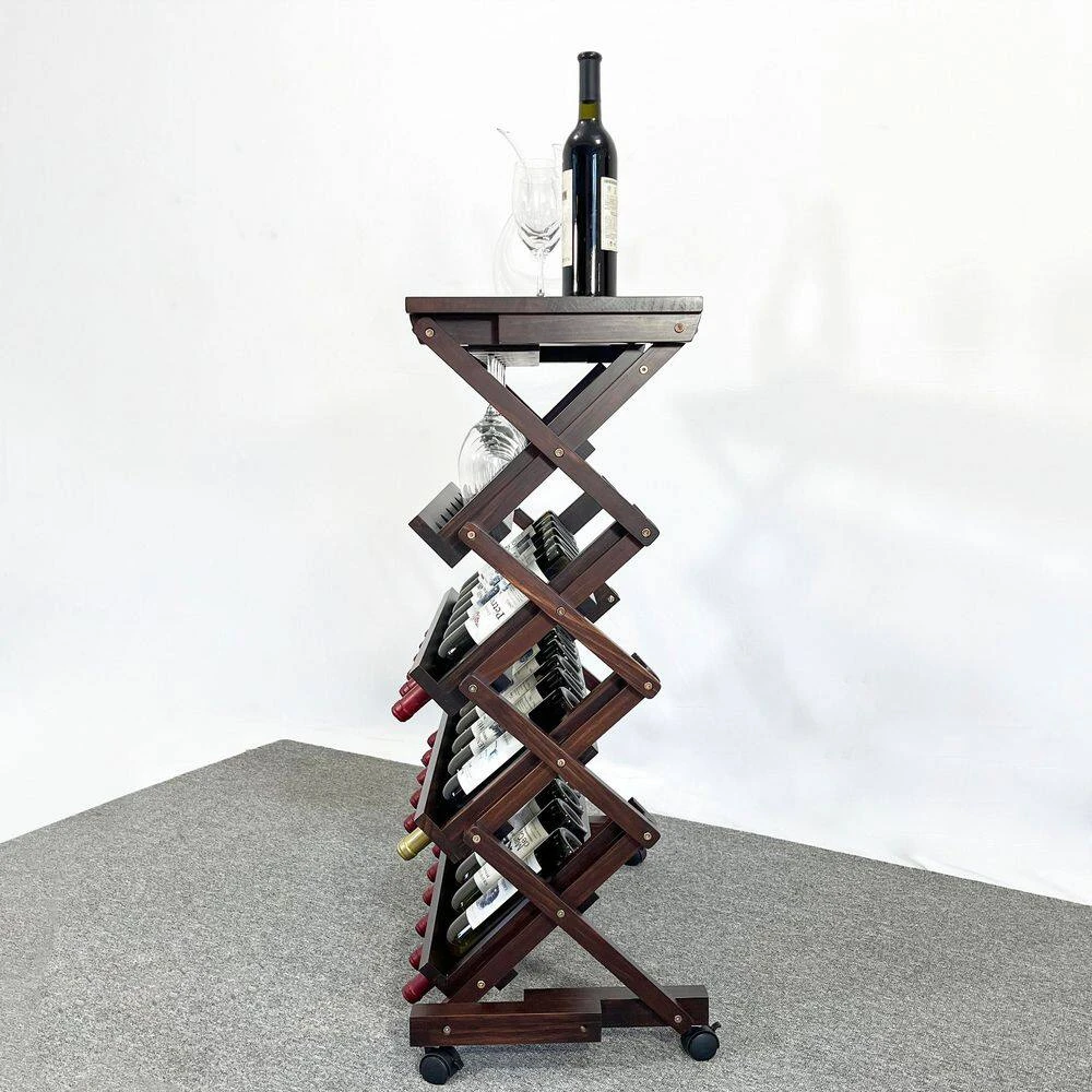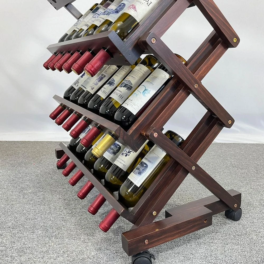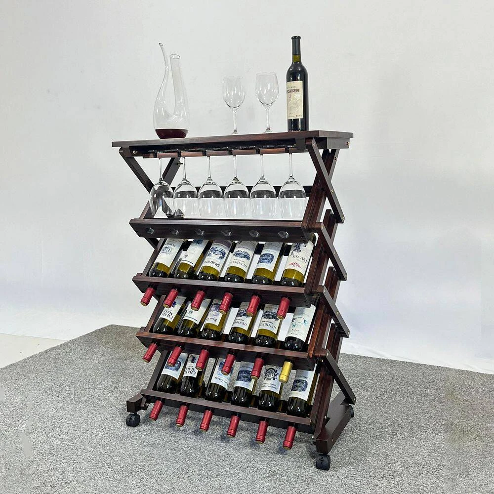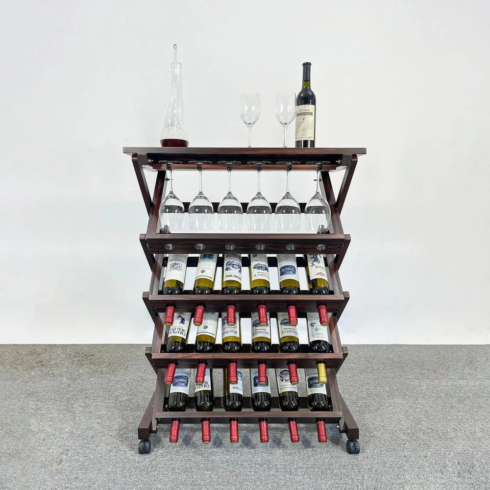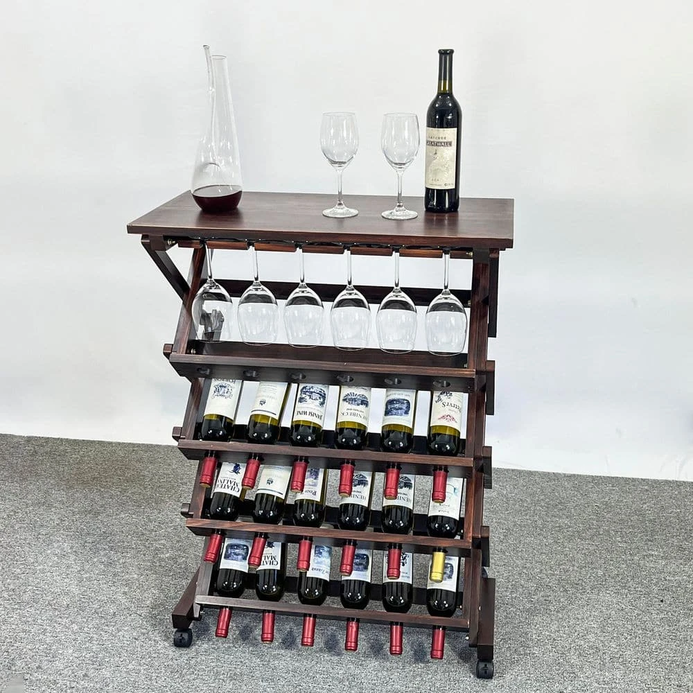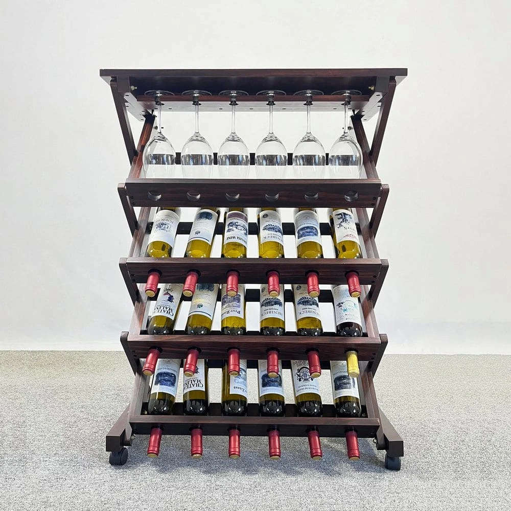 This solid wood wine rack combines natural charm, functional versatility, and easy mobility for an elegant storage solution. Crafted from high-quality natural pine wood, it features smooth, burr-free edges and a rustic finish, with the wood’s unique roasting notes subtly enhancing wine flavor during storage. Measuring approximately 29.92 in. x 15.75 in. x 40 in. it offers flexible storage: hold 24 wine bottles or 18 bottles plus 6 wine glasses, ideal for small gatherings or large collections. The bottom universal wheels allow effortless movement between living rooms, dining areas, or basements, while the built-in glass card slots securely accommodate various wine glass types. Its stylish and simple design blends seamlessly with multiple home decor styles, adding warmth and sophistication to any space. Assembly is straightforward with included studs and instructions, and the rack undergoes rigorous quality testing for stability and durability. Whether as a practical storage unit or a decorative centerpiece, this wine rack elevates your home with natural beauty and functional elegance, backed by quality assurance for worry-free use.