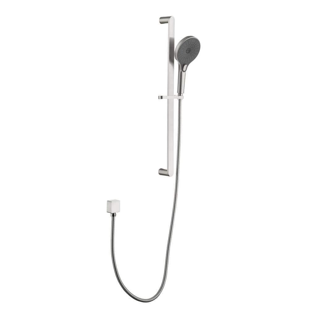 The SHOWERS Stainless Steel Slide Bar Grab Rail combines durability and safety with its robust stainless steel construction and secure mount design, supporting up to 100 lbs. It features functional spray settings for a variety of relaxing options, alongside a height-adjustable shower head slider that accommodates different users, including children, pet bathing and seated showering. The 69 in. ultra-flexible shower hose ensures extended reach for the handheld shower, enhancing versatility. This package includes a handheld shower, a slide bar with push-summary height selection and a 69 in. double-interlock stainless steel hose, providing a complete showering solution.