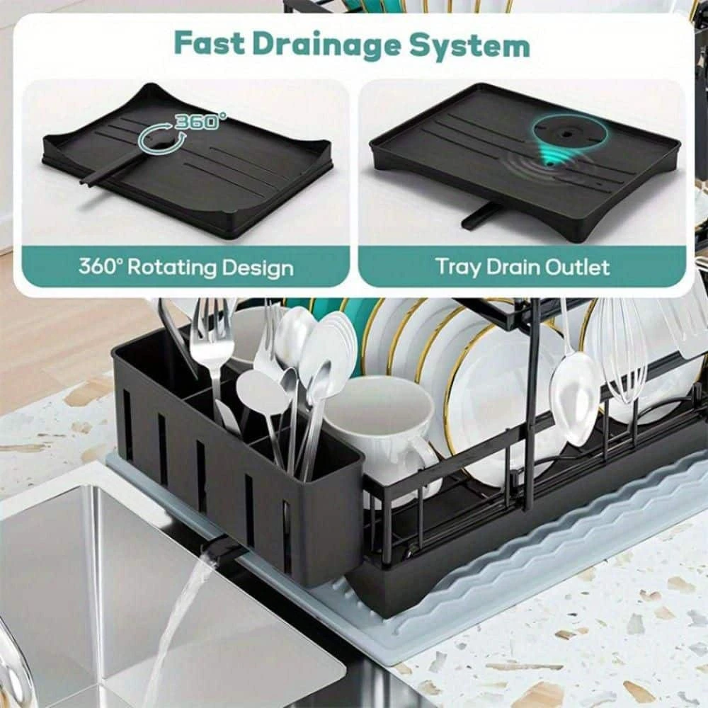 This 3-tier dish drying rack revolutionizes kitchen organization with its sleek design and automatic 360° drainage system, keeping countertops clutter-free and dry. Crafted from premium rust-proof materials, it ensures long-lasting durability while its tool-free assembly allows quick setup in minutes. Blending style with functionality, the glossy finish elevates kitchen aesthetics, while the modular structure maximizes space to hold dishes efficiently. As a bonus, it comes with a premium microfiber cloth for easy cleaning and polishing, making it a practical and elegant addition to any kitchen.