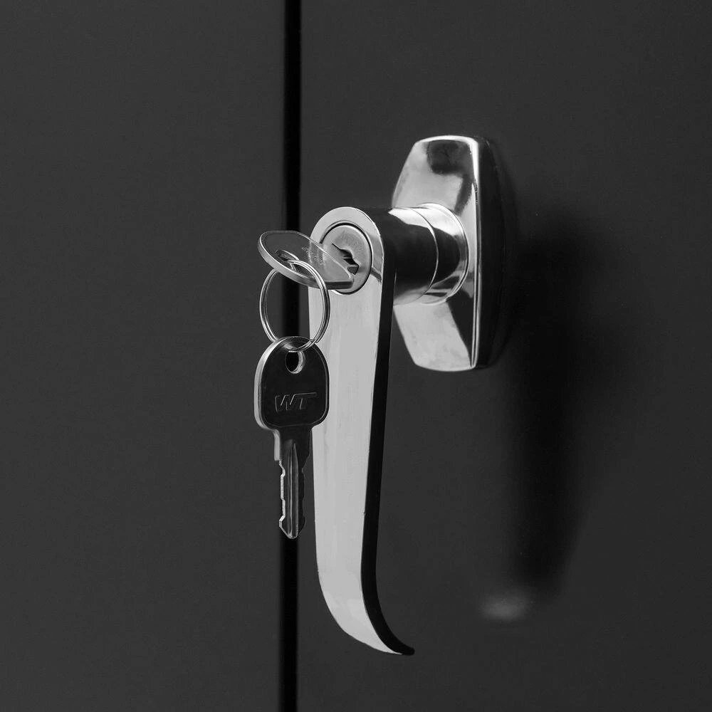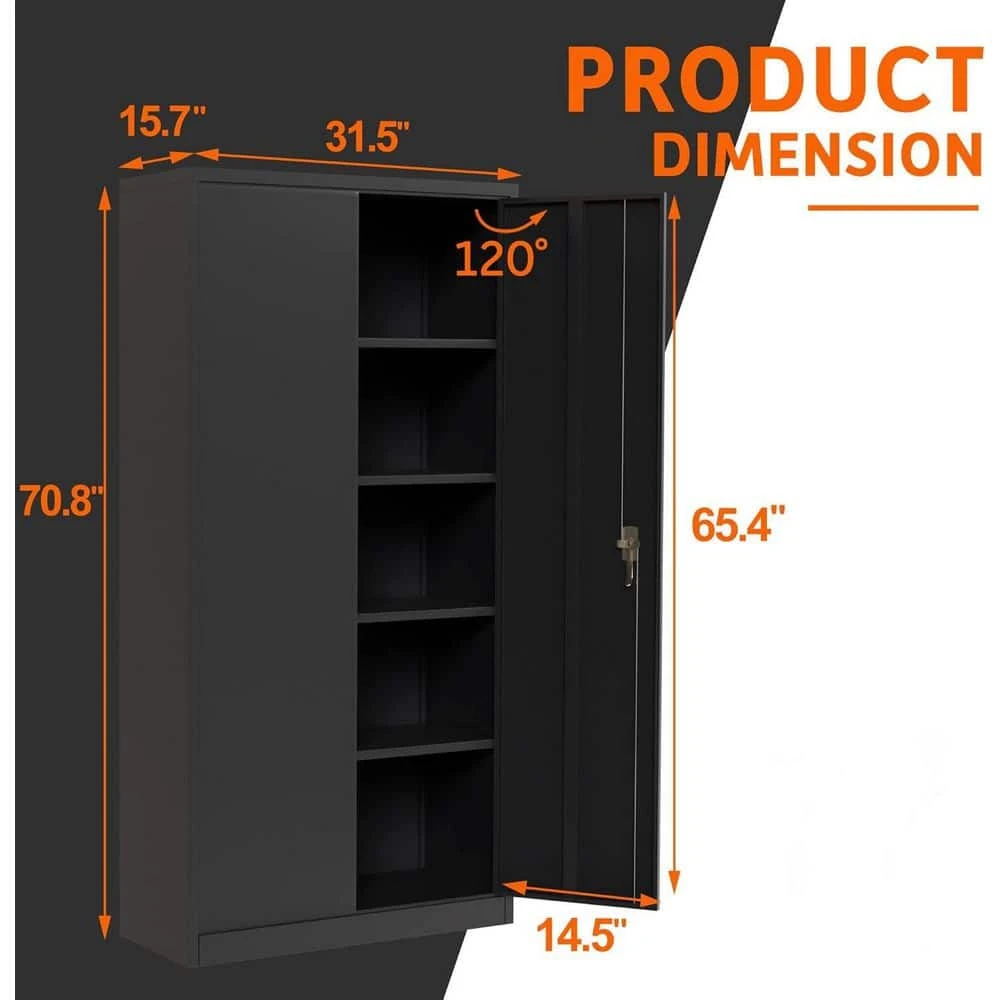 The double-door, 4-adjustable-shelf lockable garage storage cabinet can accommodate large and small items with ease. Each shelf can bear 150 lbs. so you can store heavy documents and tools without any worries. The upgraded 3-point interlocking system is matched with a thickened steel rod, and 2-keys provide double protection. The anti-collision reinforcement design is quiet and durable. The black metal material is versatile and can be used in many scenarios. It comes with installation instructions, making it a safe choice for protecting important items from home garages to offices.