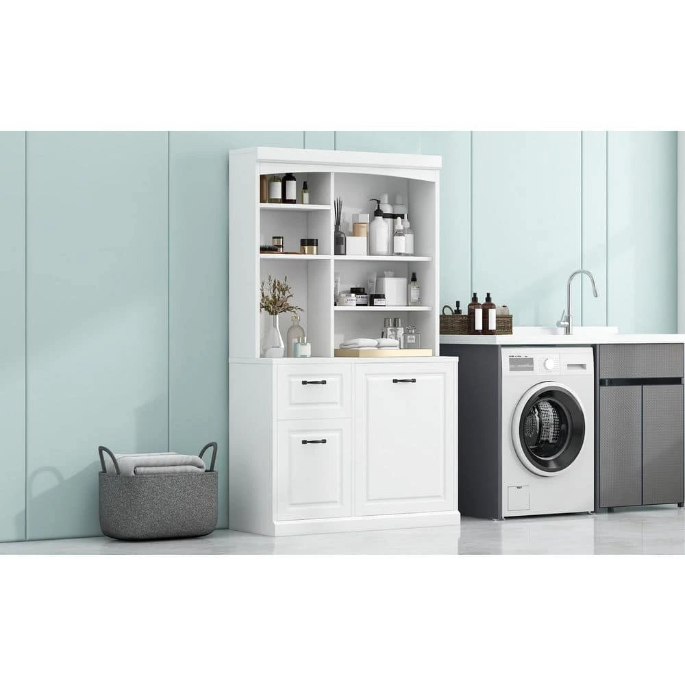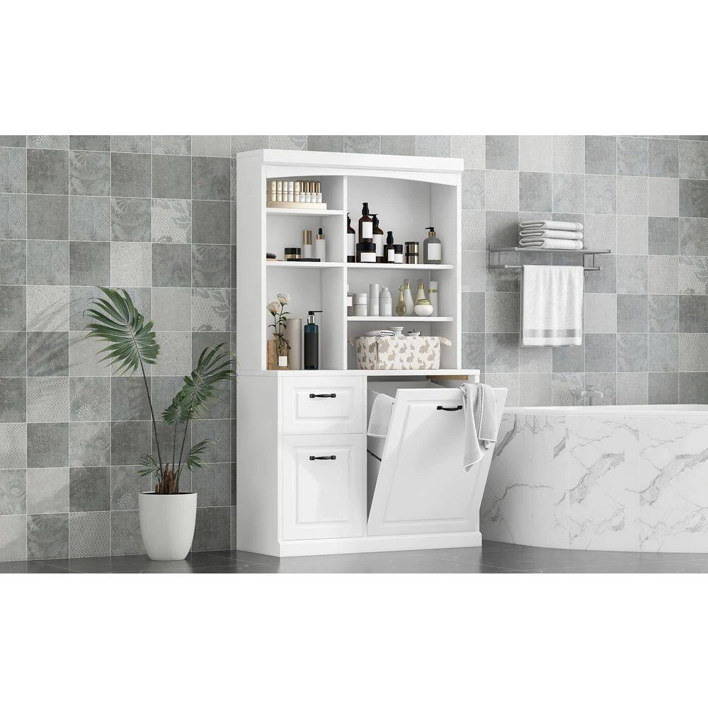 This tall bathroom storage cabinet combines functionality and modern design, featuring a spacious tilt-out hamper with a built-in basket for discreet storage of laundry or bath linens. Its multi-functional design includes 2 adjustable shelves and 6 open compartments, allowing flexible organization of toiletries and daily items, while two easy-glide drawers on metal glides provide convenient storage for smaller essentials. Crafted from durable MDF with a smooth painted finish, the cabinet resists moisture and is easy to clean, complemented by matte black steel handles for a sleek aesthetic. Standing 70.9 in. tall, it maximizes vertical space without occupying too much floor area, supporting up to 60kg (132 lbs.) for versatile use in bathrooms, laundry rooms, or closets. The tilt-out hamper keeps spaces tidy, while adjustable shelving adapts to various storage needs, making it a practical and stylish addition to any home.
