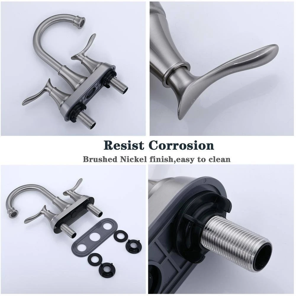 2-Handle 4 in. Brushed Nickel Bathroom Faucet remains durable and beautiful over time thanks to its solid brass construction. We have been committed to providing customers with satisfactory services, with the purpose of customer first. Exceed industry longevity standards, ensuring durable performance. Bathroom vanity sink faucets with pop-up drain and supply hoses suitable for rent house, new condo, single-apartment, motor home, travel trailer and family use.
