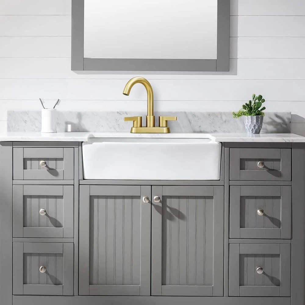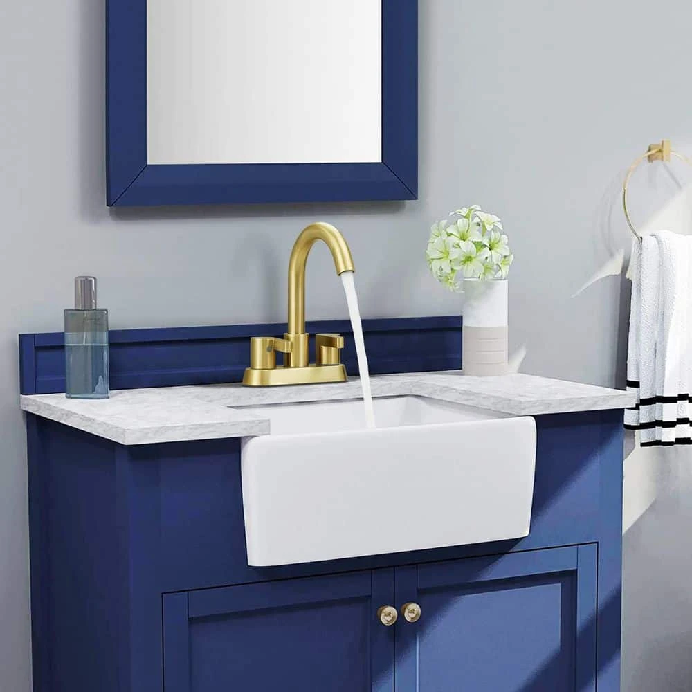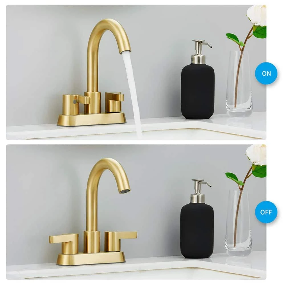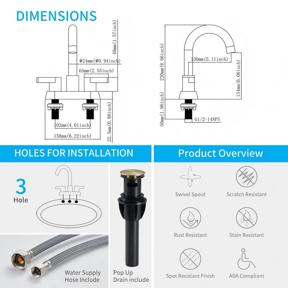 Our centerset bathroom faucet, recommended for bathroom use, stands out with its exceptional blend of quality, design, and functionality. Constructed with a high – quality 304 stainless-steel body and a lead-free waterway, it’s not only fingerprint – free but also highly resistant to corrosion, making it a perfect addition to enhance your bathroom’s decor.The faucet’s exquisite design features a 360° swivel spout and double straight handles. The swivel spout allows for greater flexibility in use, while the handles enable precise and easy control over water temperature and volume. The high – arc spout offers unrestricted use, and its easy-to-clean nozzle simplifies daily maintenance. This design suits most bathroom aesthetics.Installation is hassle – free. The brushed – gold faucet comes with a plastic pop – up sink drain assembly with overflow and 2 high – density solid braided nylon tub water supply lines. With a 4 in. centerset and 3-hole mount design, along with detailed installation instructions, you can set it up quickly. Measuring a spout height of 6.1 in. (154mm), spout reach of 5.1 in. (130mm), and an overall height of 8.7 in. (220mm), it fits countertops with a maximum thickness of 1.0