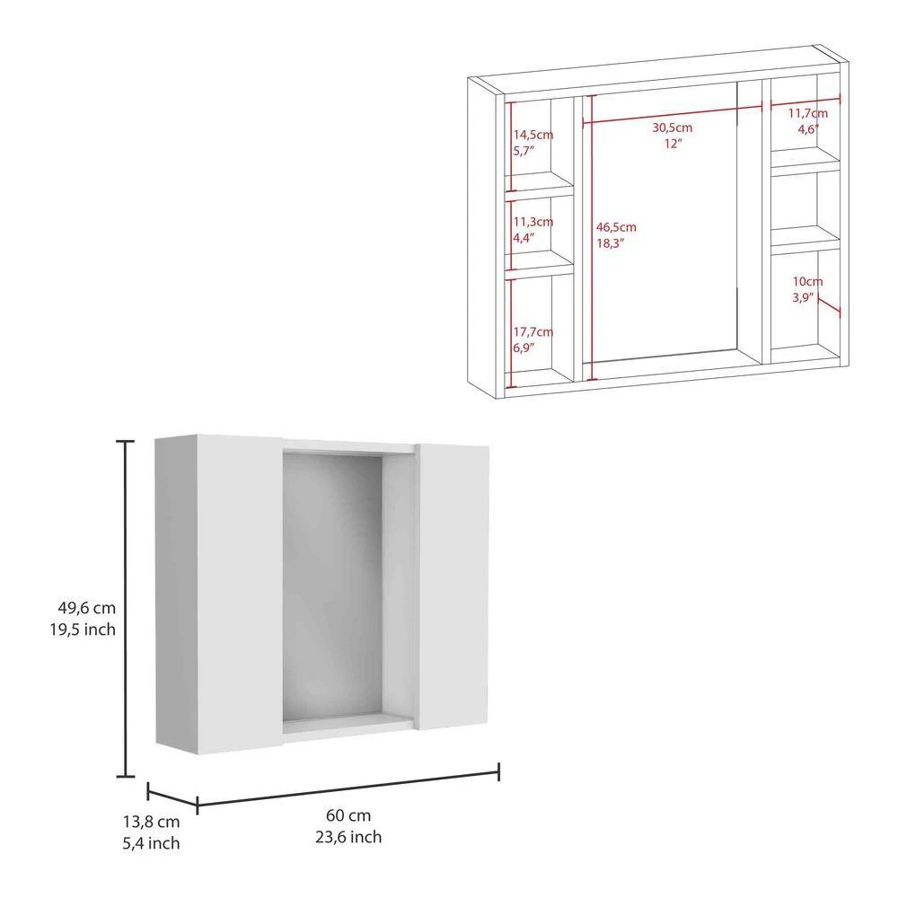The bathroom medicine cabinet boasts a space-saving design, incorporating six interior shelves for organized storage of toiletries and daily essentials. Its modern aesthetics are complemented by dimensions of 20.1 in. wide, 5.1 in. deep, and 22.8 in. high, making it ideal for mounting over a sink or toilet. Easy to assemble with clear instructions and requiring only a screwdriver, it includes all necessary hardware. Stylishly featuring a double-door cabinet and a central mirror with a small open shelf, the cabinet is crafted from high-quality, humidity-resistant laminated particle board, ensuring durability and great looks. The mirror measures 18 in. high by 12 in. wide.