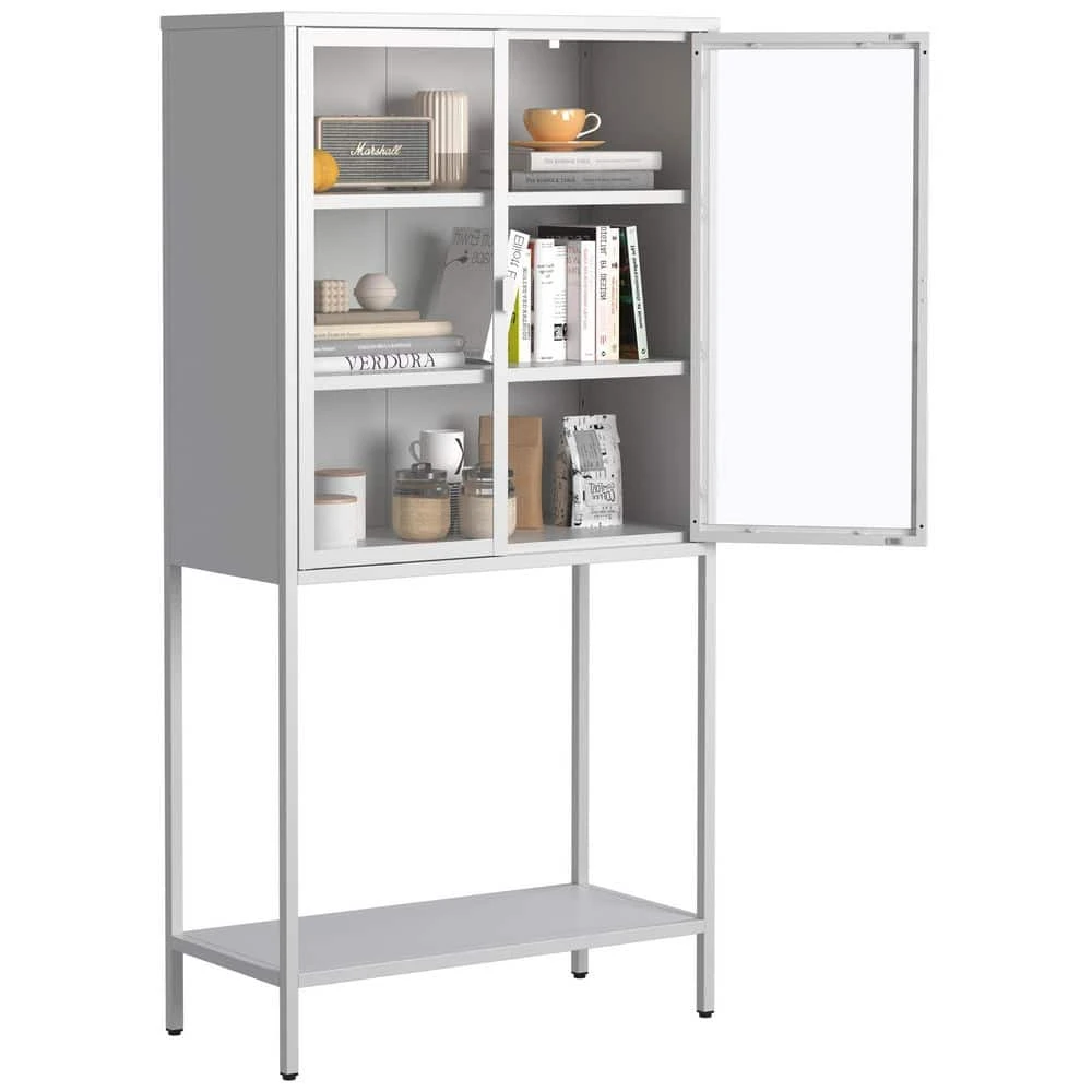 This 59 in. H Heavy Duty Metal Storage Cabinet is a great addition to homes and offices, combining function, durability, and style. Made of thickened cold-rolled steel, it’s strong, stable, and resistant to deformation, perfect for heavy loads. It has 2-adjustable shelves for flexible storage. The adjustable feet with anti-scratch caps keep it stable on uneven floors and make cleaning underneath easy. The doors have a magnetic closure for quiet operation and an elegant handle for a modern look. The tempered flat glass doors are shatter-resistant, adding elegance and visibility. For safety, there’s an anti-tipping device. This cabinet is highly versatile. It can be used in the kitchen for cookware, in the living room for decor, in the bedroom for clothes, in the office for documents, and in the children’s room for toys. It’s also eco-friendly, being free of formaldehyde. Its sleek design and smooth top, which can be used for display or storage, blend well with any decor.