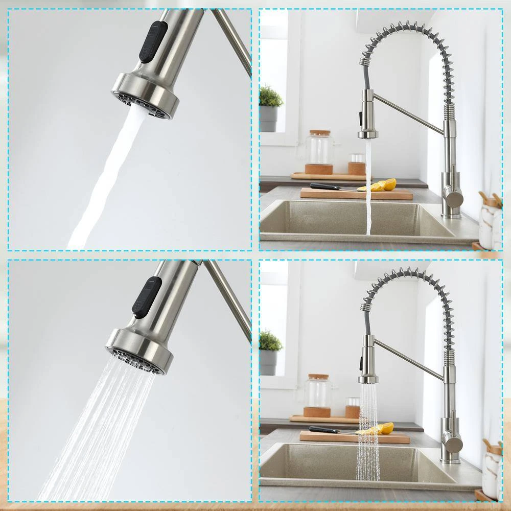 Discover our versatile commercial-style spring kitchen faucet, a perfect fusion of timeless elegance and exceptional functionality. Designed with clean lines and classic detailing, this Single Handle Spring Kitchen Faucet in Brushed Nickel elevates any kitchen decor, blending retro charm with modern sophistication. The brushed nickel finish adds a warm, muted luster, creating a striking focal point that complements both industrial and contemporary spaces.Engineered for practicality, the faucet features a tall sprayer height that allows effortless cleaning of large pots and kitchenware without worrying about scratches or damage. Its 2-function sprayer offers a steady stream for filling containers and a powerful spray for rinsing, delivering consistent water pressure while maintaining a soft, splash-free flow for eco-friendly water conservation. The high-arc 360° swivel spout ensures full sink coverage, while the pull-down design minimizes splashes during use. A single-handle lever provides intuitive control over hot and cold water, streamlining daily kitchen tasks.Maintenance is a breeze thanks to the smudge-resistant brushed nickel surface, which repels dirt and water stains-simply wipe with a cloth to keep it looking pristine. Whether you’re outfitting a modern kitchen or adding a touch of vintage flair, this faucet combines durable construction, user-friendly features, and timeless style, making it an essential upgrade for any home.