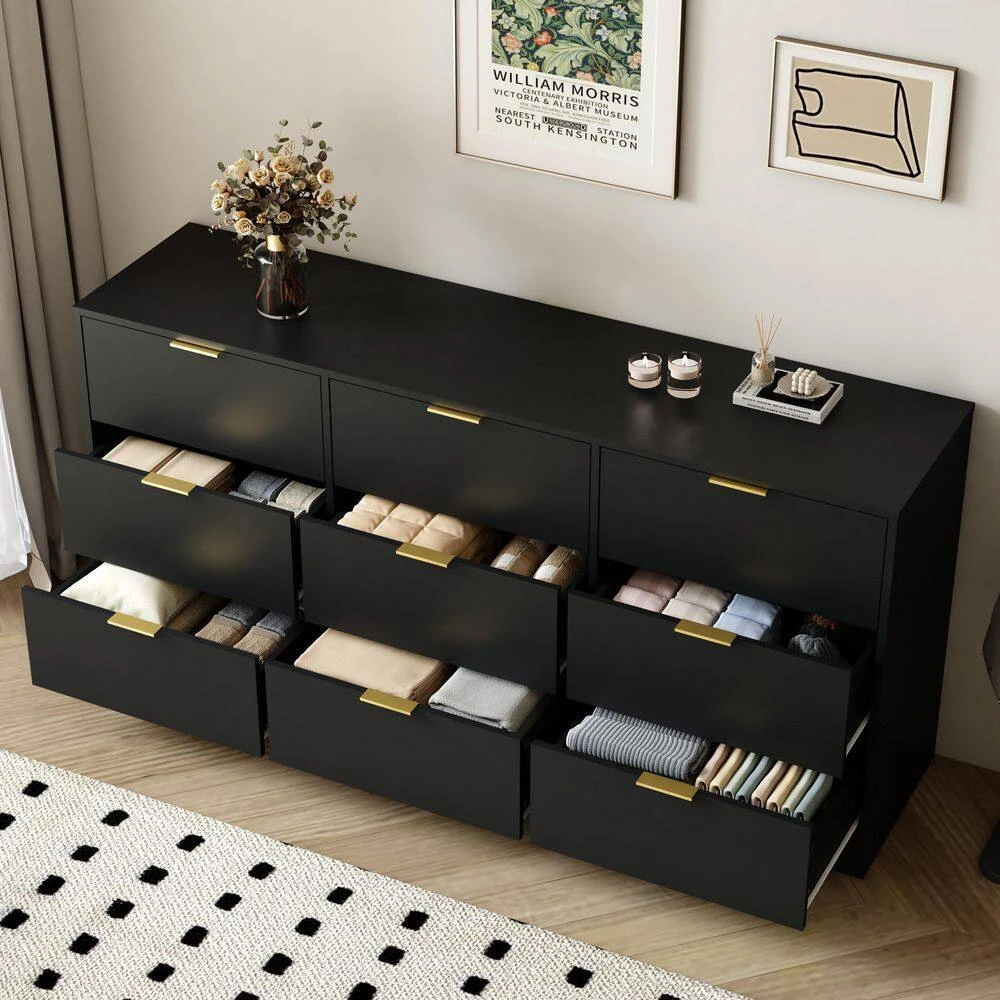 - Modern 9-Drawer Design: Black chest with golden handles; classic, simple style fits any decor.