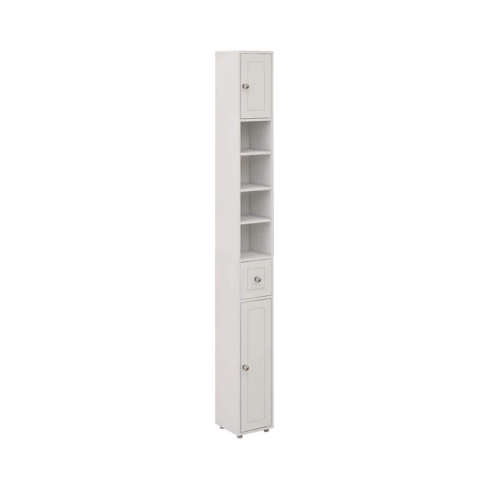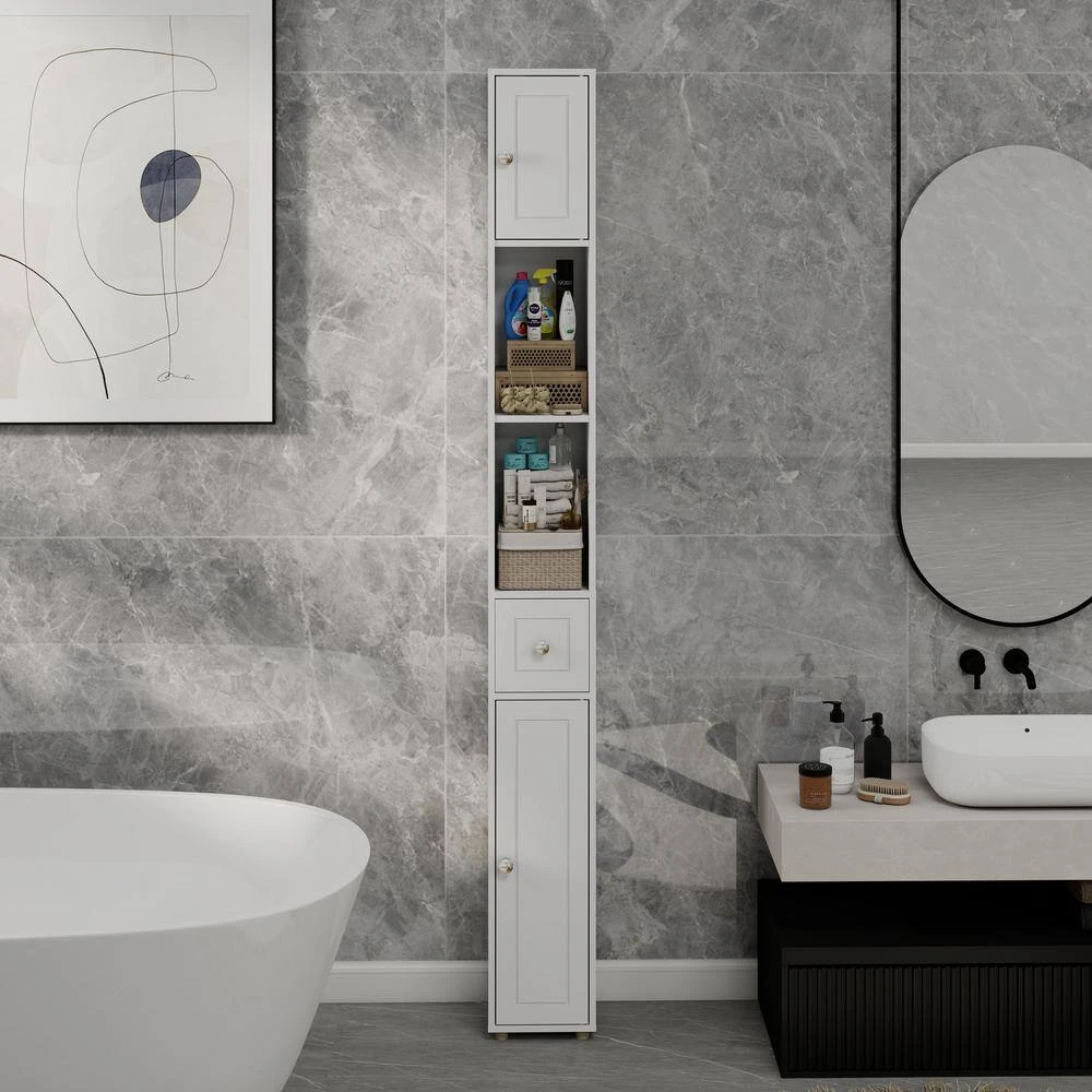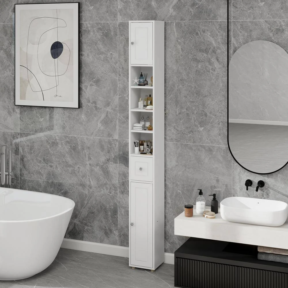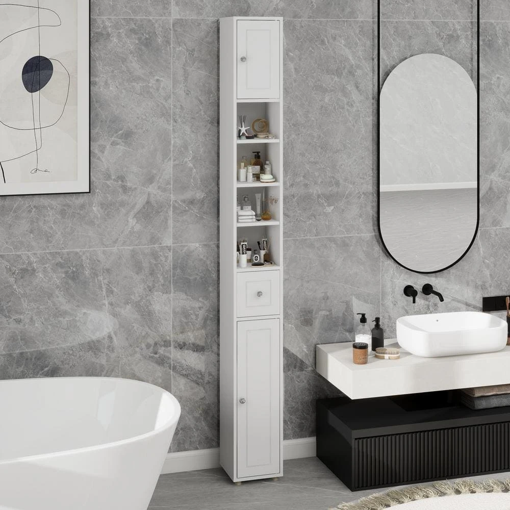 This bathroom storage cabinet features a simple and stylish wood grain design in modern white, suitable for any home decor and ideal for various rooms including bathrooms, laundry rooms, kitchens, and more. With an elevated bottom design to prevent water damage, it boasts ample storage space through 2 cabinets, 4 compartments, and 1 drawer. Perfect for small spaces or narrow areas, its dimensions are 7.87 in. x 7.87 in. x 70.87 in. (L x W x H). Featuring 4 adjustable shelves (3 with 3 levels and 1 with 6 levels), it offers customizable storage options. Made of high-quality E1 MDF with eco-friendly UV painting, the cabinet is waterproof, non-toxic, and includes an anti-tip wall-mount design for stability and safety. Easy to assemble with clear instructions provided.