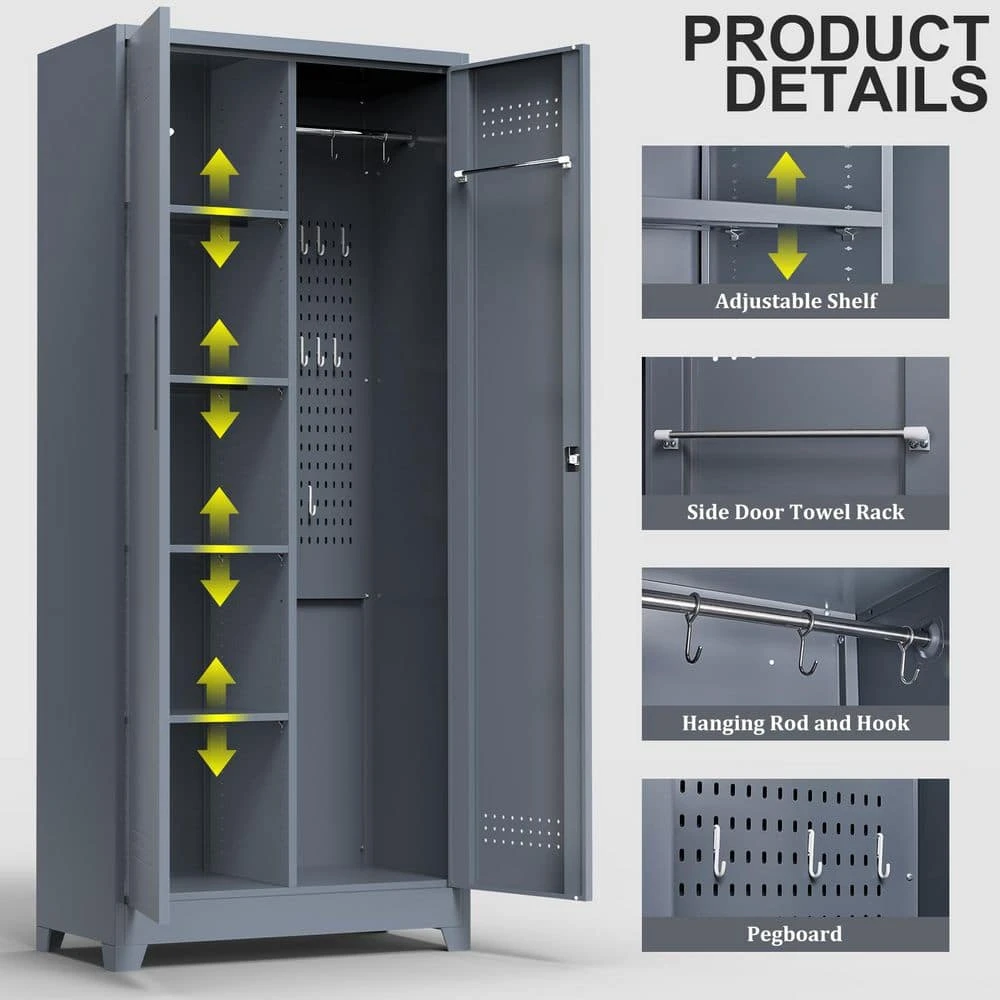 This heavy-duty storage cabinet is built for durability and stability-it’s entirely made of high-quality steel, with a reinforced internal steel frame that boosts load-bearing capacity, and its metal surface has anti-corrosion and anti-rust treatment to extend service life. It’s highly functional for storage: equipped with hanging rods (for tools, clothes, towels) and shelves, it works great as a garage storage unit for cleaning tools, a basement storage cabinet, or even an office cabinet. Designed with practical details, it has bottom holes to prevent water accumulation (so wet mops can be stored safely) and door ventilation holes for moisture resistance and breathability. Assembly is also easy: it comes with detailed instructions and installation videos, and professional staff are available to answer questions if you encounter any issues.