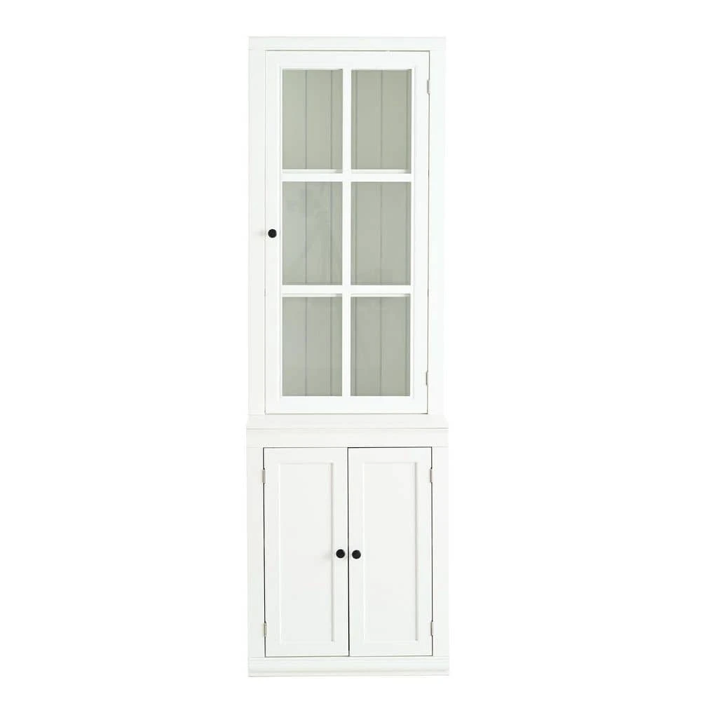 This 75.25” tall, 23.65” wide retro-style display cabinet blends functionality and style, ideal for living rooms, studies, hallways, and offices. It has a double-action bi-directional door (install as left or right-hand) and tempered glass door to display collectibles dust-free, plus 2 solid cabinet doors and 2 adjustable shelves-balancing secure display with clutter organization for china, books, plants, or decor.With a retro-modern design (neutral white finish fits modern/traditional spaces) and ample storage (23.65