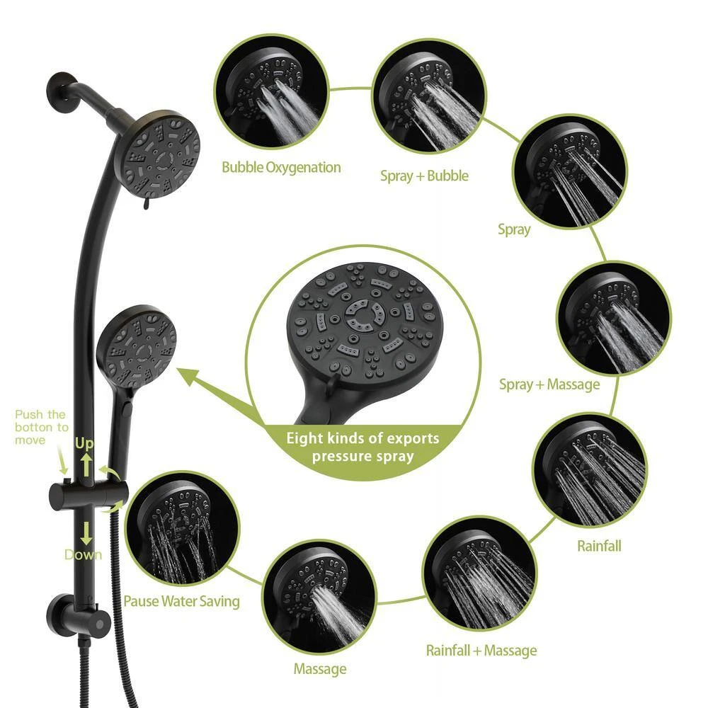 This shower system features 8-settings, including rain, massage, and spray modes, allowing you to tailor your shower experience to your preferences and enjoy a soothing, massage-like comfort. The 59 in. stainless steel hose provides extra reach and flexibility, while the 4.7 in. large surface sprinkler head with a silica gel outlet nozzle is easy to clean and resistant to clogging. The special shower holder allows you to adjust the angle of the shower to suit your needs, preventing wet hair and fatigue. Additionally, the set includes an adjustable slide bar that can be tailored to suit different heights, making it a great choice for users of all ages. The complete package comes with the shower head, adjustable hand-held shower, sliding adjustable rod, shower holder, hose, stainless steel shower arm with enamel cover, gaskets, plumber’s tape, and installation manual.