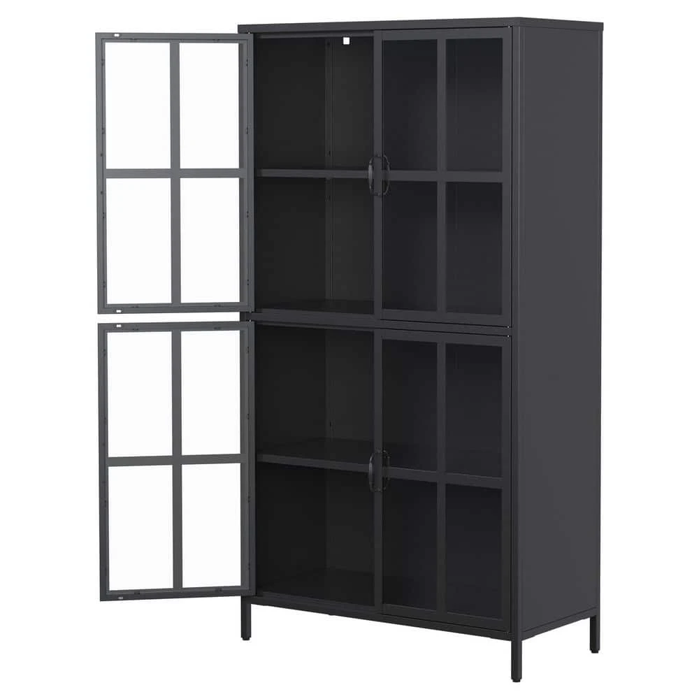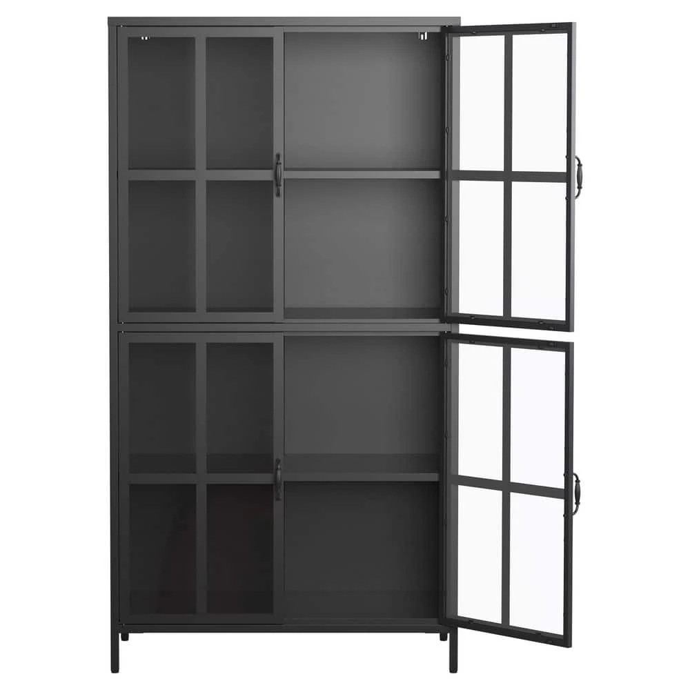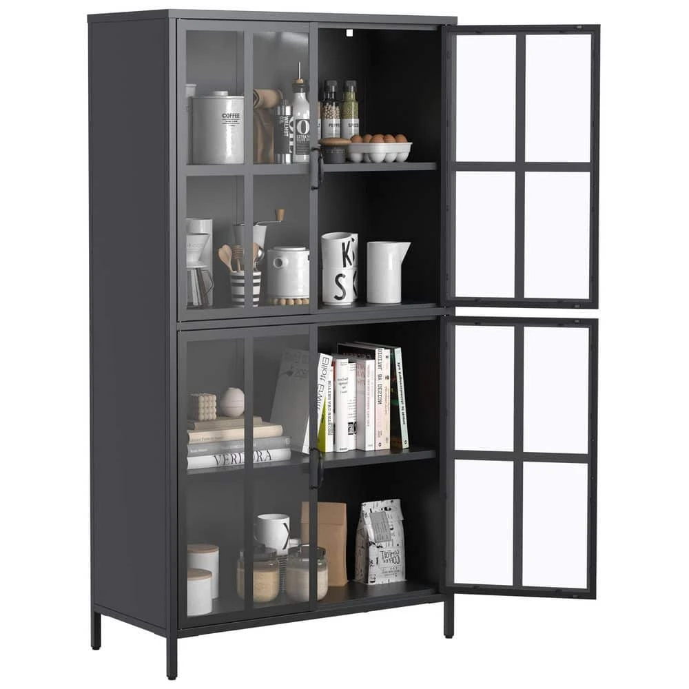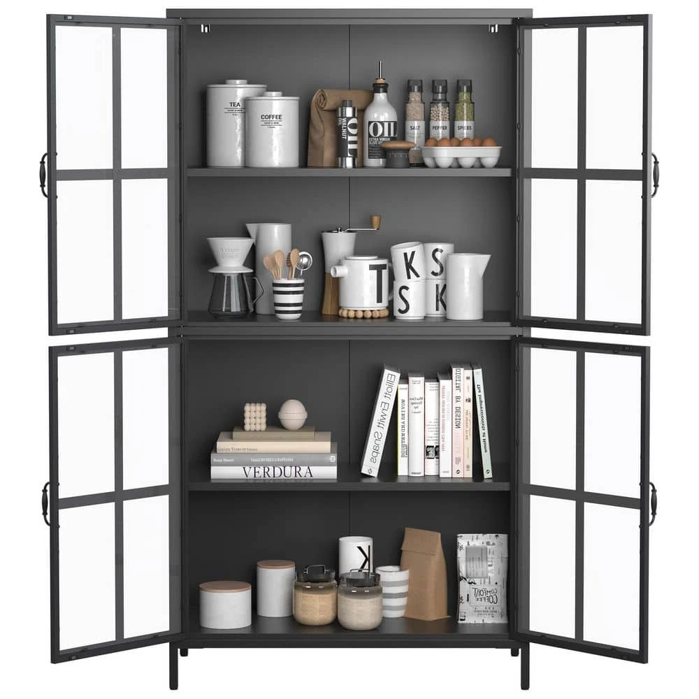 Our Premium Black Metal Storage Cabinet is designed to transform your home or office space with its exceptional durability and aesthetic appeal. Made from high – quality steel and tempered glass, it offers outstanding strength and stability. It features spacious storage with large upper and lower compartments and adjustable shelves to fit items of various heights, maximizing storage. Safety is a priority with an anti – tipping device to protect kids and pets. The magnetic silent closure ensures a secure and quiet operation, keeping your space noise – free. Adjustable feet allow for easy cleaning underneath and provide stability on uneven surfaces. Its versatile design suits the living room, dining room, bedroom, or kitchen, adding elegance with sleek black finish and Roman handles. Assembly is a breeze as it comes with an instruction manual, installation gloves, a screwdriver, and numbered parts, and you can scan the QR code in the manual for an installation video to save time. The top can support up to 100 lbs and each adjustable and bottom shelf up to 66 lbs, making it a robust storage solution for all your household, office, or kitchen needs.