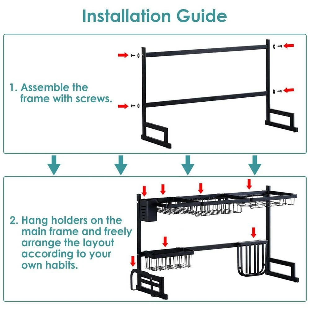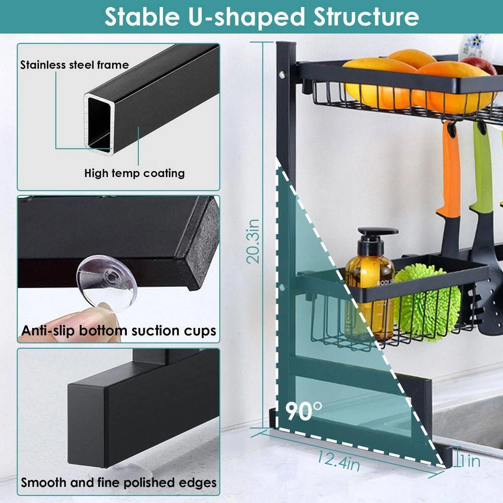 Want to say goodbye to kitchen clutter and maximize the space above the sink. This double-layer stainless steel sink rack is your ideal choice. It has a large capacity and includes multiple baskets and racks to neatly store dishes, cutlery, knives and even fruits and vegetables. Made of high-quality rust-proof stainless steel, it can bear up to 88 lbs. and is easy to install, helping you easily create a neat and efficient dream kitchen.