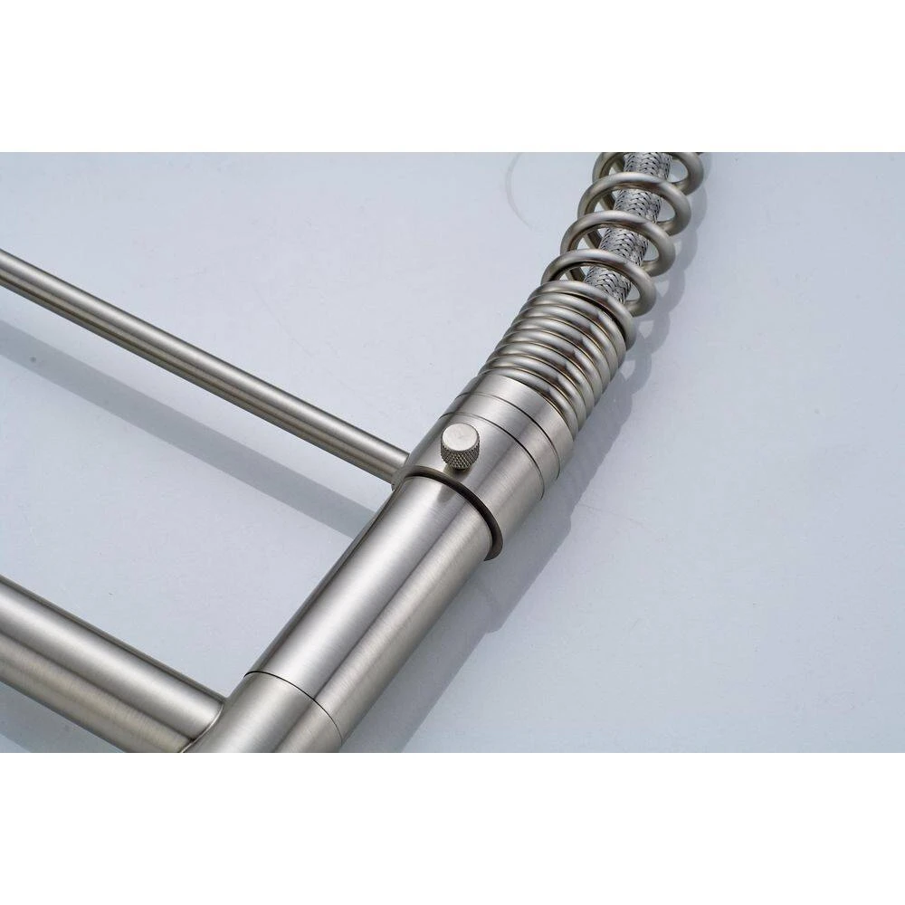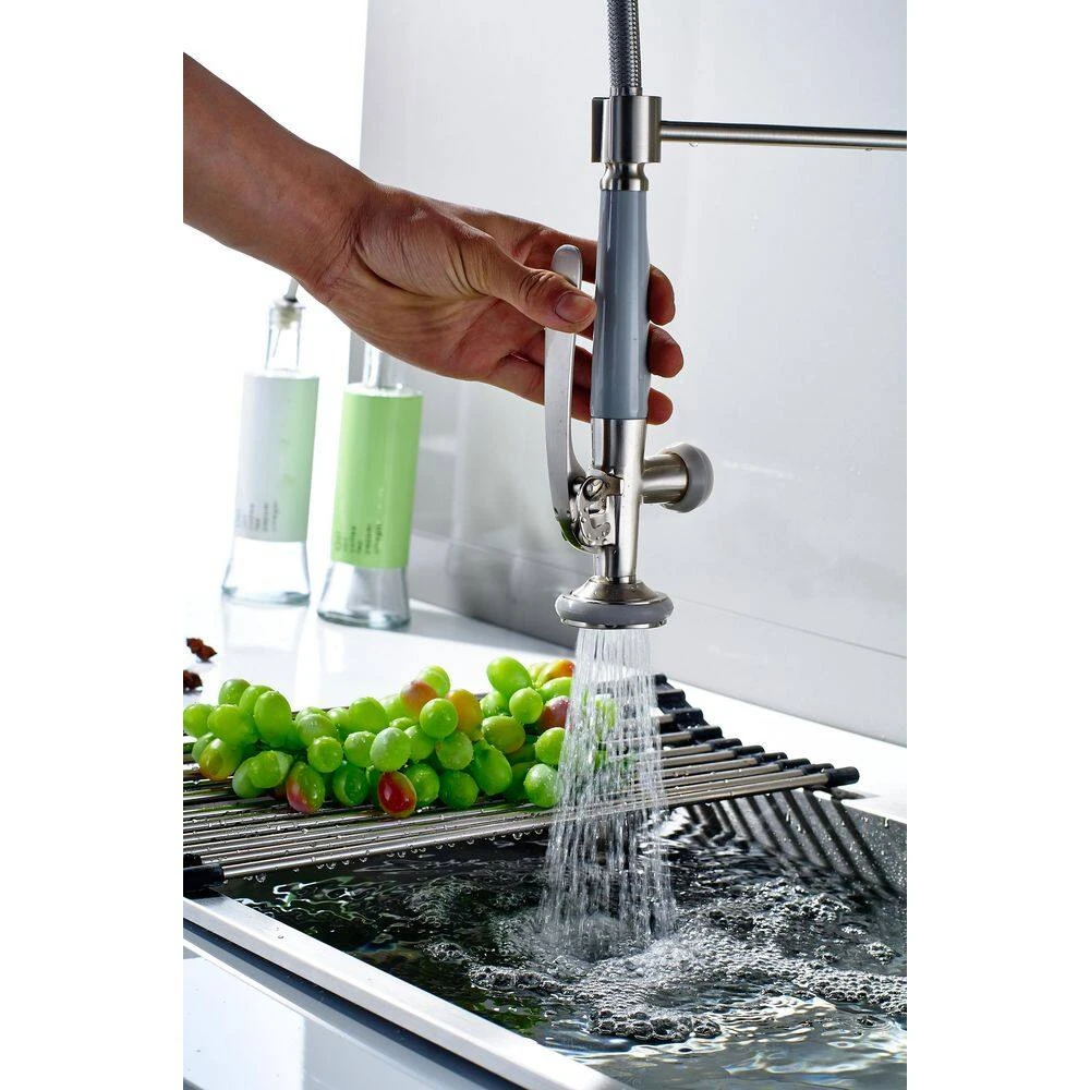 This commercial – style kitchen faucet with a pull – down sprayer is a remarkable addition to any kitchen. Crafted entirely from brass instead of zinc alloy, it boasts high quality, being lead – free, highly resistant to corrosion and rust. The brushed nickel finish not only gives it an elegant look but also resists water spots and fingerprints, keeping it looking pristine. Its heavy – duty design, blending contemporary industrial style with sophistication, makes it a perfect fit for kitchen makeovers, especially for big sinks or granite countertops. The dual – function feature is a game – changer, with both the pull – down sprayer and pot filler spout able to operate simultaneously, each with its own control for 2 – sink setups. The sprayer comes with a clip for hands – free operation, delivering a powerful spray for washing, while the pot filler provides an aerated stream for filling large cookware. The single – handle design, combined with a 360 – degree swivel faucet body and spouts, offers full access to the sink, ensuring maximum convenience and flexibility in the kitchen.