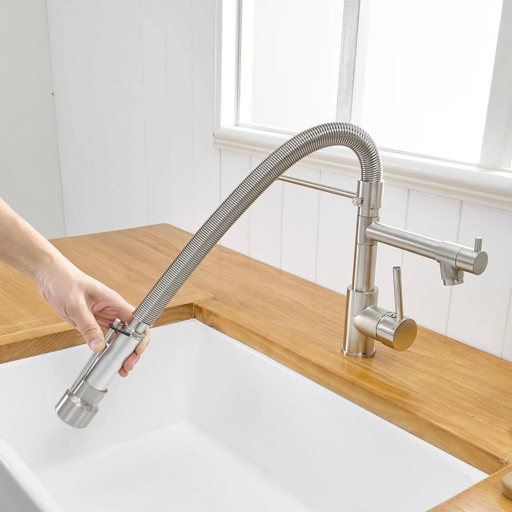 This commercial – style kitchen faucet with a pull – down sprayer is a remarkable addition to any kitchen. Crafted with a brushed nickel finish, it combines a sleek, modern aesthetic with robust functionality. Built with a solid brass interior, it offers reliable quality, being both durable and lead – free, ensuring you have access to clean water at all times. The brushed nickel coating not only looks simple and elegant but also resists rust and dirt effectively. Its 2 rotatable spouts are a standout feature; the pull – down sprayer delivers a splash – free, powerful spray for efficiently rinsing dishes, while the injected spout rotates 360° to provide a gentle, aerated water stream for easy pot and pan filling, and both can be used simultaneously to save time. With its single – handle design, adjusting the water flow and temperature is a breeze, and the 360° rotatable faucet body allows for flexible handle installation, enhancing your overall user experience and making your kitchen tasks more enjoyable than ever.