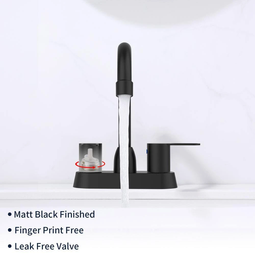 4 in. centerset design 3 hole deck mount with 2 handles for easy flow and temperature control. Superior corrosion and rust resistant matte black finish resists water spots and fading from everyday use. Constructed from durable solid copper, this beautiful commercial-style bathroom faucet is a must-have in any home.